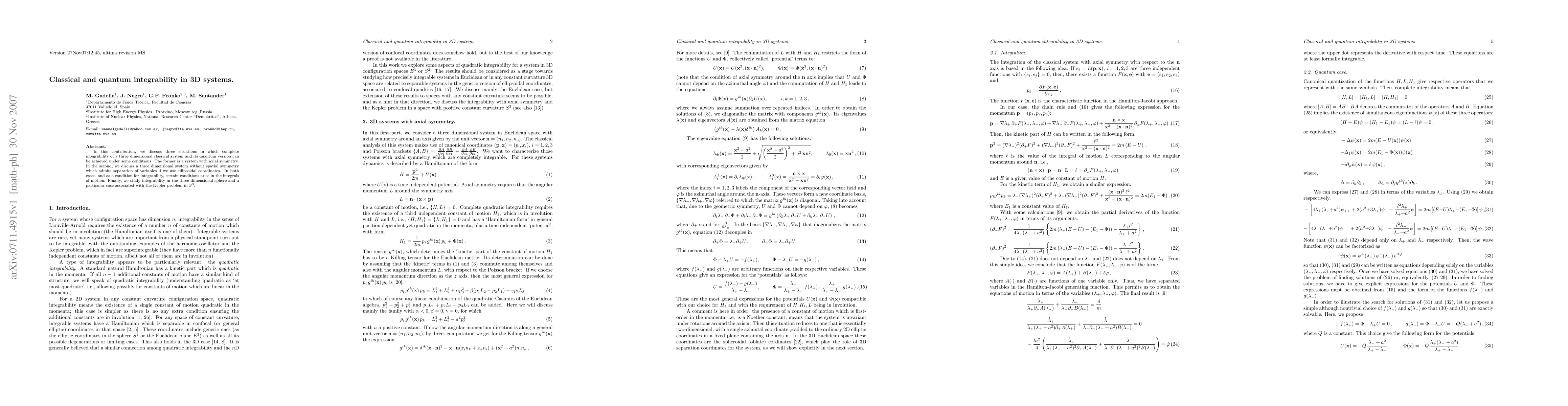 This paper explores the complete integrability of three-dimensional classical and quantum systems under specific conditions, including axially symmetric systems, systems separable in ellipsoidal coordinates, and the integrability of the three-dimensional sphere related to the Kepler problem. Conditions for integrability involve particular constraints on the integrals of motion.