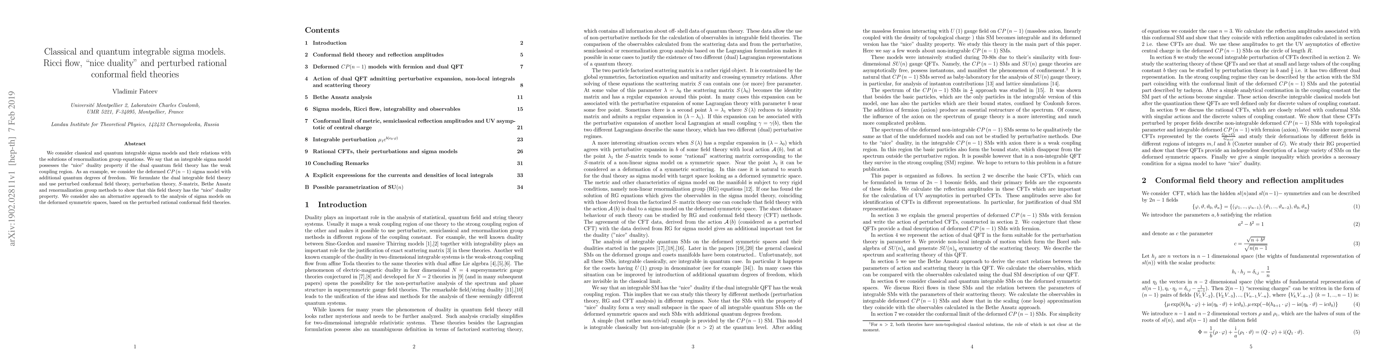This paper explores classical and quantum integrable sigma models, focusing on their relation to renormalization group solutions. It demonstrates the "nice duality" property in the deformed $CP(n-1)$ sigma model using dual field theory analysis and various quantum field theory methods. An alternative approach via perturbed rational conformal field theories is also presented.