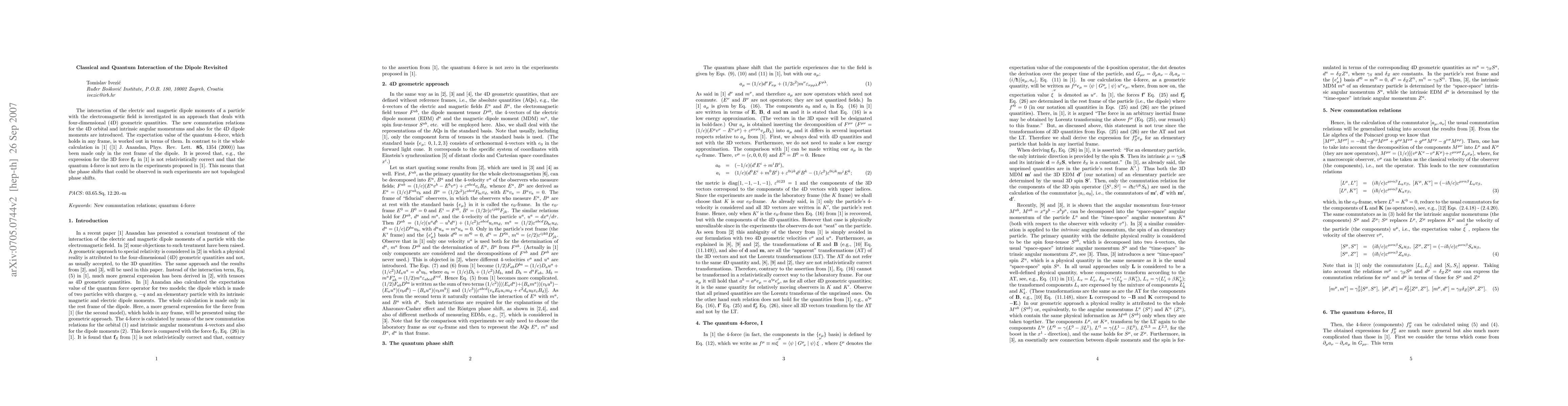 The interaction of the electric and magnetic dipole moments of a particle with the electromagnetic field is investigated in an approach that deals with four-dimensional (4D) geometric quantities. The new commutation relations for the 4D orbital and intrinsic angular momentums and also for the 4D dipole moments are introduced. The expectation value of the quantum 4-force, which holds in any frame, is worked out in terms of them. In contrast to it the whole calculation in [1] ([1] J. Anandan, Phys. Rev. Lett. \textbf{85}, 1354 (2000)) has been made only in the rest frame of the dipole. It is proved that, e.g., the expression for the 3D force $\mathbf{f}%_{S}$ in [1] is not relativistically correct and that the quantum 4-force is not zero in the experiments proposed in [1]. This means that the phase shifts that could be observed in such experiments are not topological phase shifts.