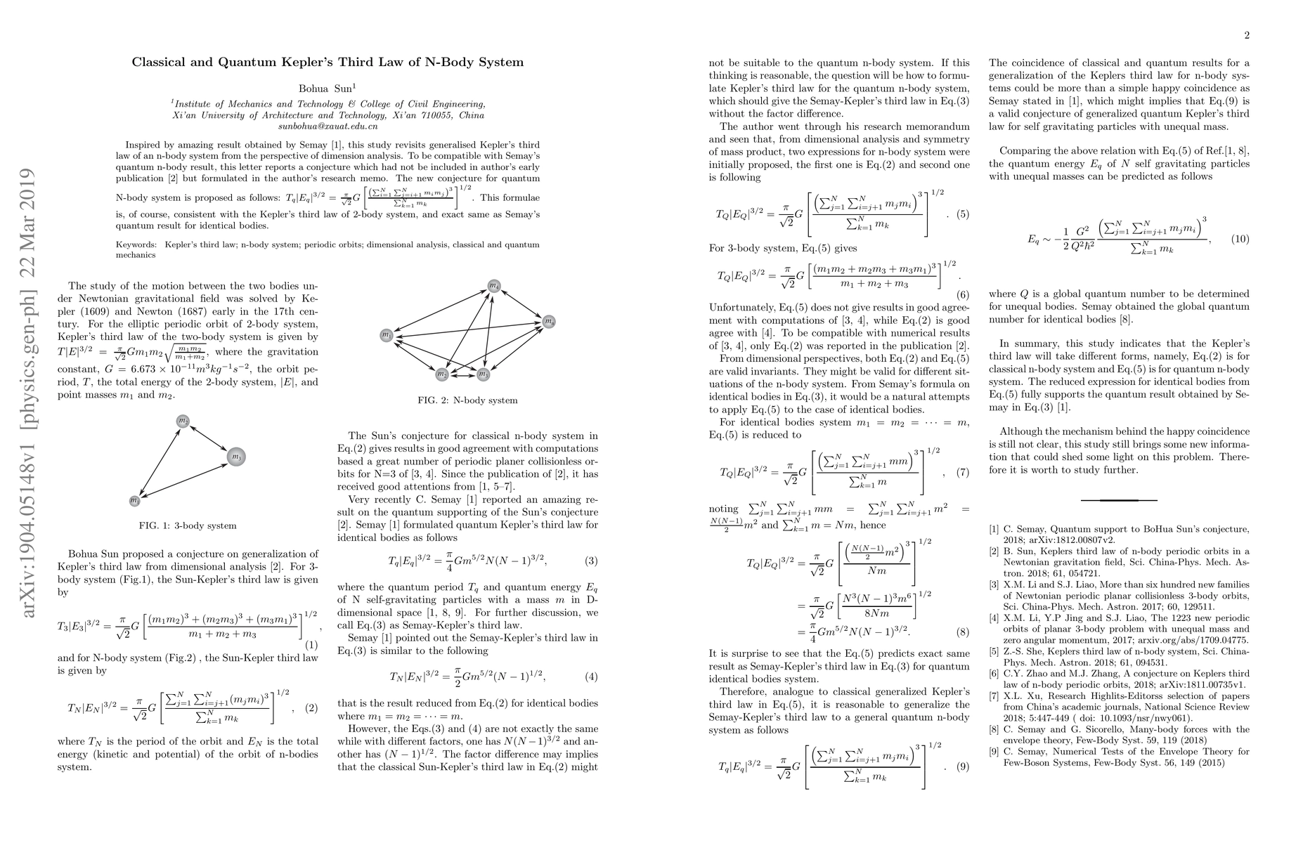 Inspired by amazing result obtained by Semay \cite{semay-1}, this study revisits generalised Kepler's third law of an n-body system from the perspective of dimension analysis. To be compatible with Semay's quantum n-body result, this letter reports a conjecture which had not be included in author's early publication \cite{sun2018} but formulated in the author's research memo. The new conjecture for quantum N-body system is proposed as follows: $T_q|E_q|^{3/2}=\frac{\pi}{\sqrt{2}} G\left[\frac{\left(\sum_{i=1}^N\sum_{j=i+1}^Nm_im_j\right)^3}{\sum_{k=1}^N m_k}\right]^{1/2}$. This formulae is, of course, consistent with the Kepler's third law of 2-body system, and exact same as Semay's quantum result for identical bodies.