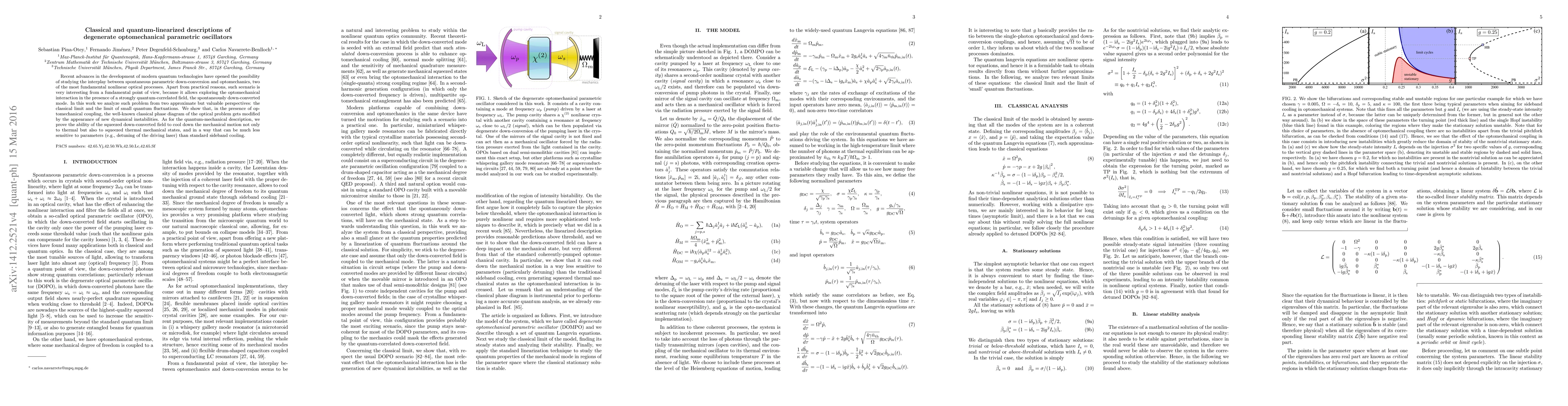 The research employs classical and quantum-linearized descriptions to analyze degenerate optomechanical parametric oscillators, examining the interplay between spontaneous parametric down-conversion and optomechanics.