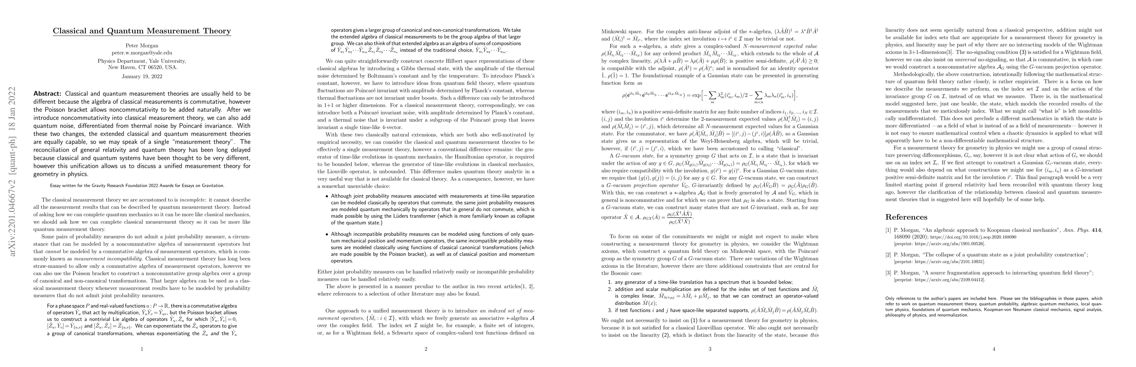 Classical and quantum measurement theories are usually held to be different because the algebra of classical measurements is commutative, however the Poisson bracket allows noncommutativity to be added naturally. After we introduce noncommutativity into classical measurement theory, we can also add quantum noise, differentiated from thermal noise by Poincar\'e invariance. With these two changes, the extended classical and quantum measurement theories are equally capable, so we may speak of a single "measurement theory". The reconciliation of general relativity and quantum theory has been long delayed because classical and quantum systems have been thought to be very different, however this unification allows us to discuss a unified measurement theory for geometry in physics.