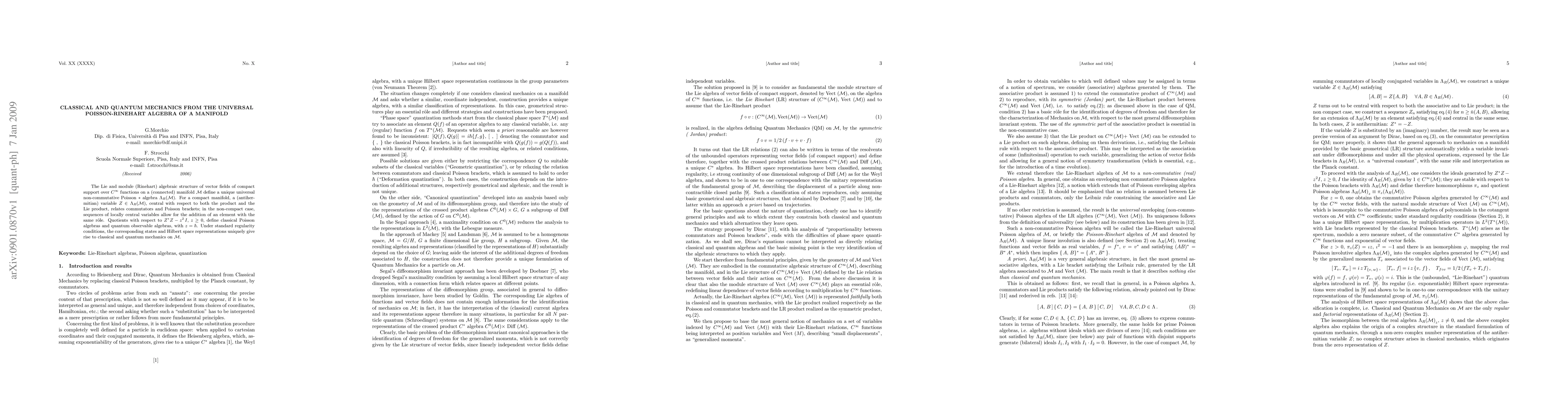 The Lie and module (Rinehart) algebraic structure of vector fields of compact support over C infinity functions on a (connected) manifold M define a unique universal non-commutative Poisson * algebra. For a compact manifold, a (antihermitian) variable Z, central with respect to both the product and the Lie product, relates commutators and Poisson brackets; in the non-compact case, sequences of locally central variables allow for the addition of an element with the same role. Quotients with respect to the (positive) values taken by Z* Z define classical Poisson algebras and quantum observable algebras, with the Planck constant given by -iZ. Under standard regularity conditions, the corresponding states and Hilbert space representations uniquely give rise to classical and quantum mechanics on M.