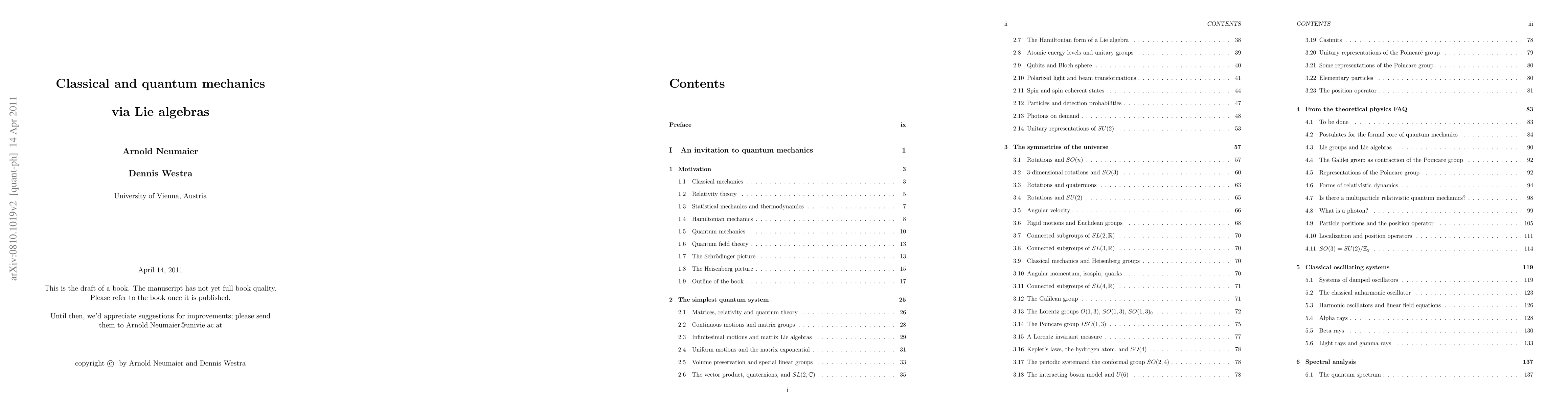 This book presents classical and quantum mechanics through the lens of Lie algebras and Lie groups, emphasizing their structural similarities and providing a deeper algebraic perspective. It offers a precise and exact treatment of mechanics concepts, serving as a valuable complement for physics students seeking a broader understanding beyond standard textbook material.