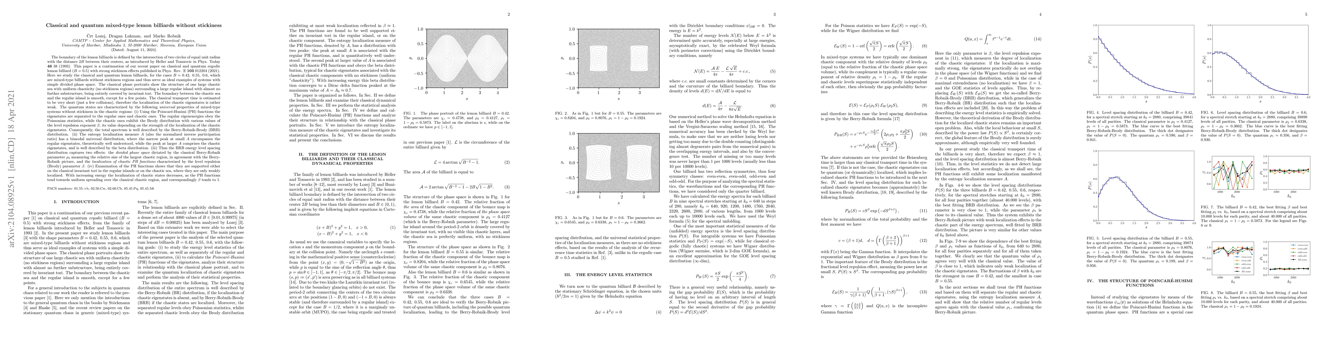 Researchers studied classical and quantum lemon billiards without stickiness, finding universal properties of mixed-type systems with chaotic regions described by the Berry-Robnik-Brody distribution, which combines Poissonian statistics for regular eigenenergies and Brody distribution for chaotic ones.