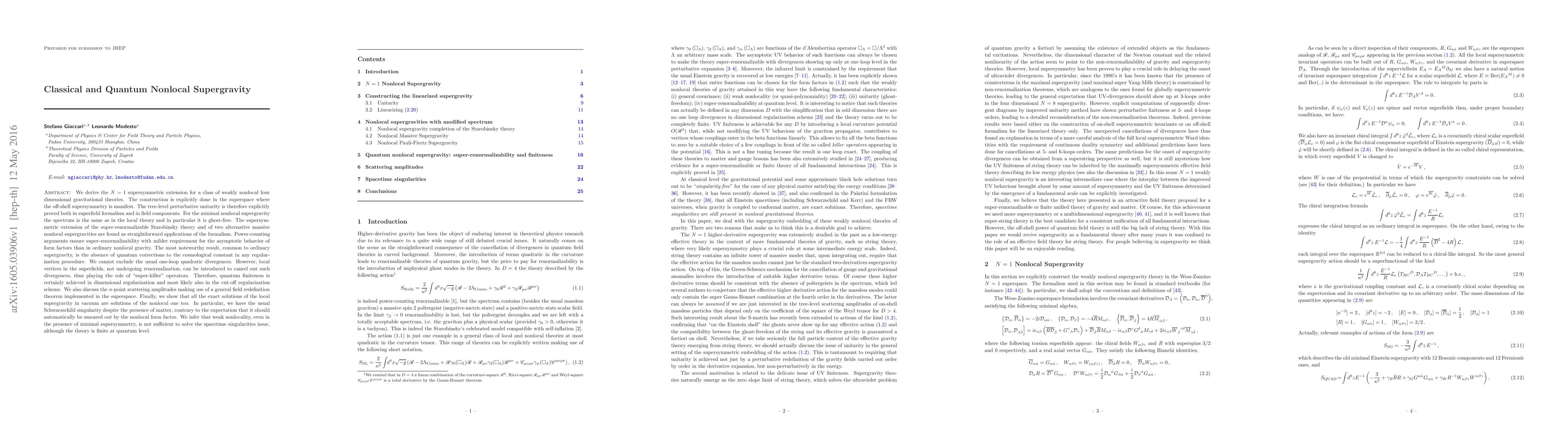 We derive the N=1 supersymmetric extension for a class of weakly nonlocal four dimensional gravitational theories.The construction is explicitly done in the superspace and the tree-level perturbative unitarity is explicitly proved both in the superfield formalism and in field components. For the minimal nonlocal supergravity the spectrum is the same as in the local theory and in particular it is ghost-free. The supersymmetric extension of the super-renormalizable Starobinsky theory and of two alternative massive nonlocal supergravities are found as straightforward applications of the formalism. Power-counting arguments ensure super-renormalizability with milder requirement for the asymptotic behavior of form factors than in ordinary nonlocal gravity. The most noteworthy result, common to ordinary supergravity, is the absence of quantum corrections to the cosmological constant in any regularization procedure. We cannot exclude the usual one-loop quadratic divergences. However, local vertices in the superfields, not undergoing renormalization, can be introduced to cancel out such divergences. Therefore, quantum finiteness is certainly achieved in dimensional regularization and most likely also in the cut-off regularization scheme. We also discuss the n-point scattering amplitudes making use of a general field redefinition theorem implemented in the superspace. Finally, we show that all the exact solutions of the local supergravity in vacuum are solutions of the nonlocal one too. In particular, we have the usual Schwarzschild singularity. We infer that the weak nonlocality, even in the presence of minimal supersymmetry, is not sufficient to solve the spacetime singularities issue, although the theory is finite at quantum level.