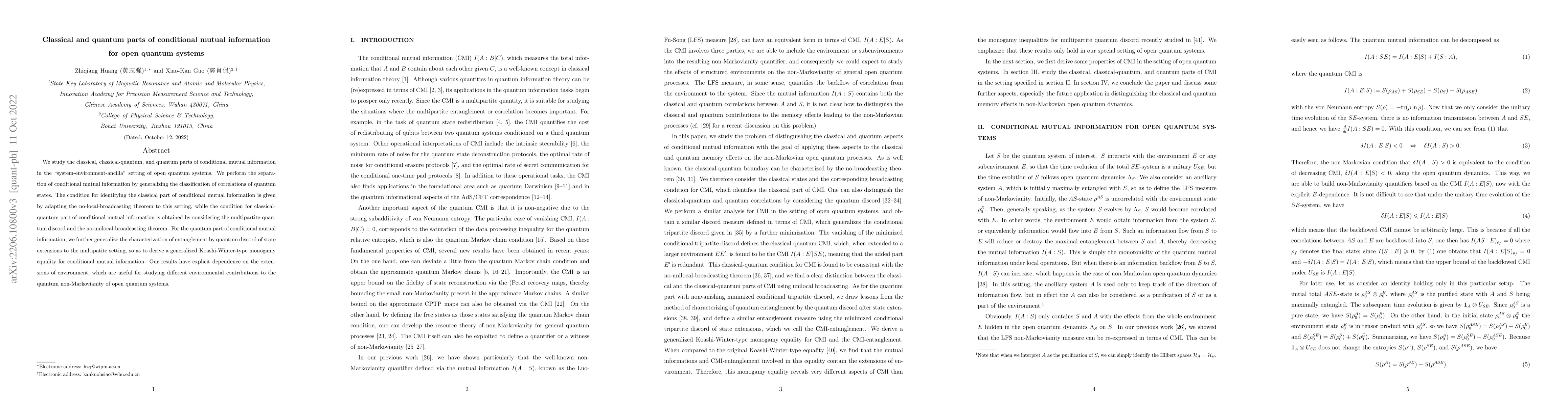 This paper investigates the classical, classical-quantum, and quantum components of conditional mutual information in open quantum systems. It generalizes the classification of quantum correlations to separate these components, providing conditions for identifying each part based on theorems like no-local-broadcasting and no-unilocal-broadcasting. The study also extends Koashi-Winter-type monogamy inequalities to conditional mutual information, highlighting the environmental contributions to quantum non-Markovianity.