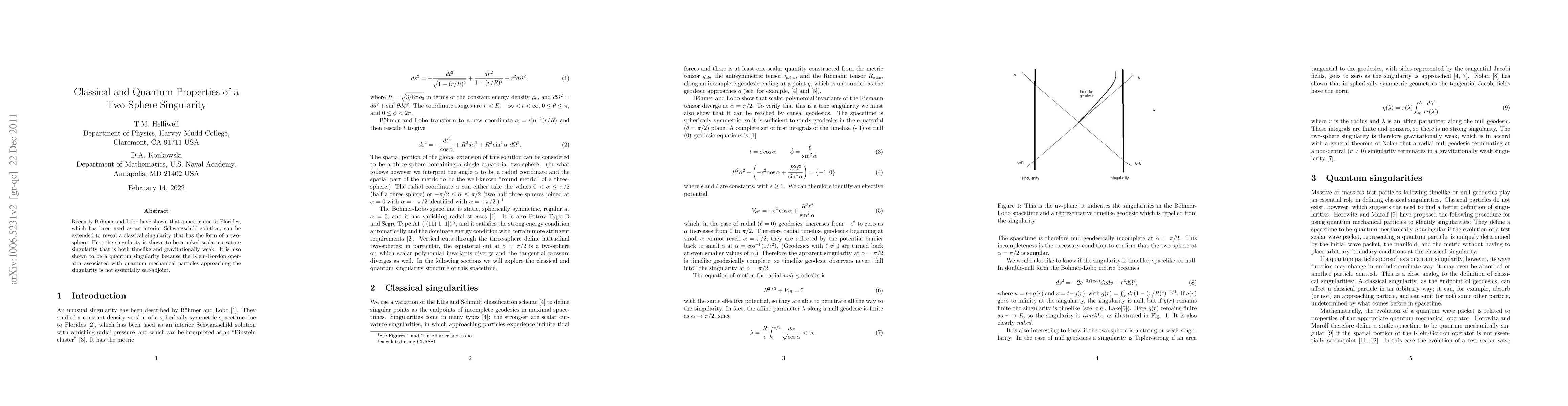 Recently Boehmer and Lobo have shown that a metric due to Florides, which has been used as an interior Schwarzschild solution, can be extended to reveal a classical singularity that has the form of a two-sphere. Here the singularity is shown to be a scalar curvature singularity that is both timelike and gravitationally weak. It is also shown to be a quantum singularity because the Klein-Gordon operator associated with quantum mechanical particles approaching the singularity is not essentially self-adjoint.