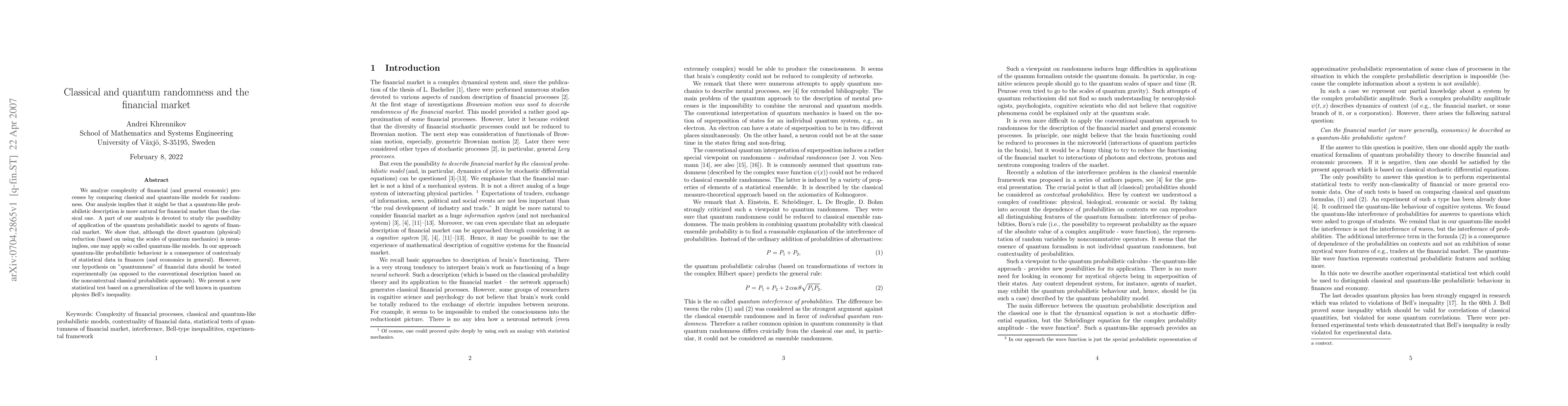 We analyze complexity of financial (and general economic) processes by comparing classical and quantum-like models for randomness. Our analysis implies that it might be that a quantum-like probabilistic description is more natural for financial market than the classical one. A part of our analysis is devoted to study the possibility of application of the quantum probabilistic model to agents of financial market. We show that, although the direct quantum (physical) reduction (based on using the scales of quantum mechanics) is meaningless, one may apply so called quantum-like models. In our approach quantum-like probabilistic behaviour is a consequence of contextualy of statistical data in finances (and economics in general). However, our hypothesis on "quantumness" of financial data should be tested experimentally (as opposed to the conventional description based on the noncontextual classical probabilistic approach). We present a new statistical test based on a generalization of the well known in quantum physics Bell's inequality.