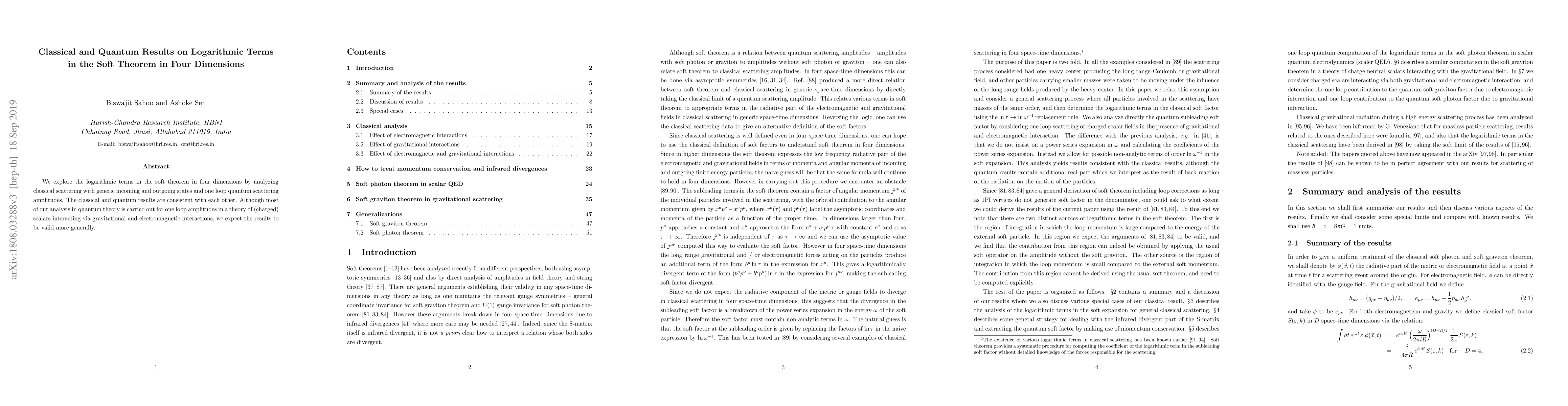 We explore the logarithmic terms in the soft theorem in four dimensions by analyzing classical scattering with generic incoming and outgoing states and one loop quantum scattering amplitudes. The classical and quantum results are consistent with each other. Although most of our analysis in quantum theory is carried out for one loop amplitudes in a theory of (charged) scalars interacting via gravitational and electromagnetic interactions, we expect the results to be valid more generally.