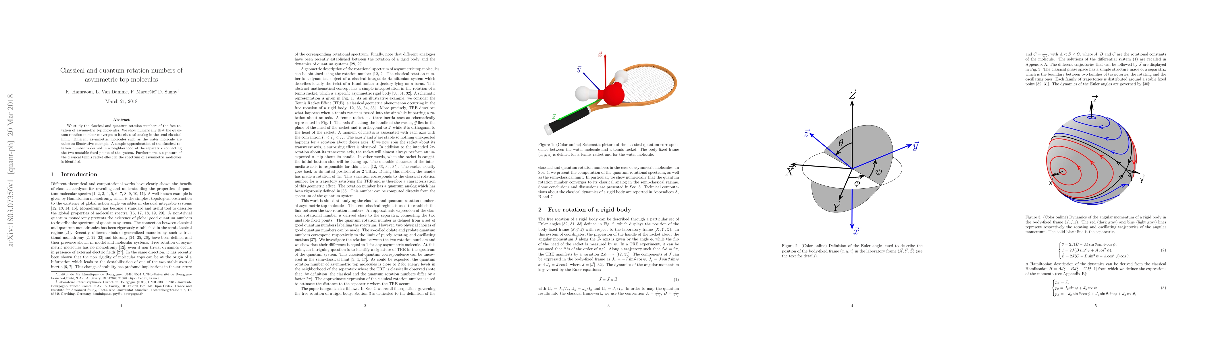We study the classical and quantum rotation numbers of the free rotation of asymmetric top molecules. We show numerically that the quantum rotation number converges to its classical analog in the semi-classical limit. Different asymmetric molecules such as the water molecule are taken as illustrative example. A simple approximation of the classical rotation number is derived in a neighborhood of the separatrix connecting the two unstable fixed points of the system. Furthermore, a signature of the classical tennis racket effect in the spectrum of asymmetric molecules is identified.