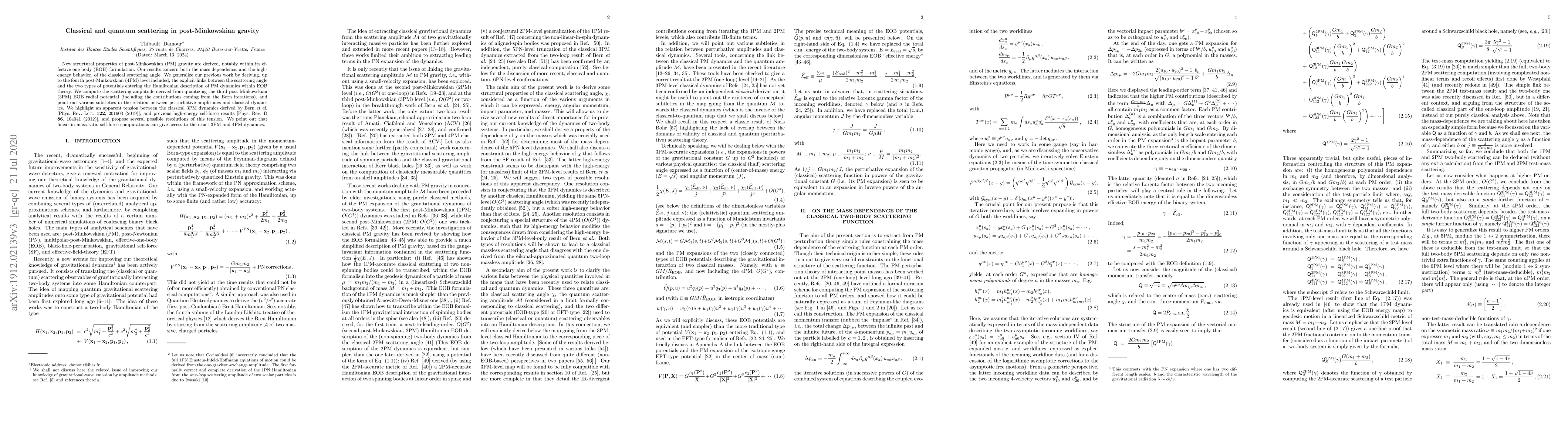 New structural properties of post-Minkowskian (PM) gravity are derived, notably within its effective one body (EOB) formulation. Our results concern both the mass dependence, and the high-energy behavior, of the classical scattering angle. We generalize our previous work by deriving, up to the fourth post-Minkowskian (4PM) level included, the explicit links between the scattering angle and the two types of potentials entering the Hamiltonian description of PM dynamics within EOB theory. We compute the scattering amplitude derived from quantizing the third post-Minkowskian (3PM) EOB radial potential (including the contributions coming from the Born iterations), and point out various subtleties in the relation between perturbative amplitudes and classical dynamics. We highlight an apparent tension between the classical 3PM dynamics derived by Bern et al. [Phys. Rev. Lett. 122, 201603 (2019)], and previous high-energy self-force results [Phys. Rev. D 86, 104041 (2012)], and propose several possible resolutions of this tension. We point out that linear-in-mass-ratio self-force computations can give access to the exact 3PM and 4PM dynamics.