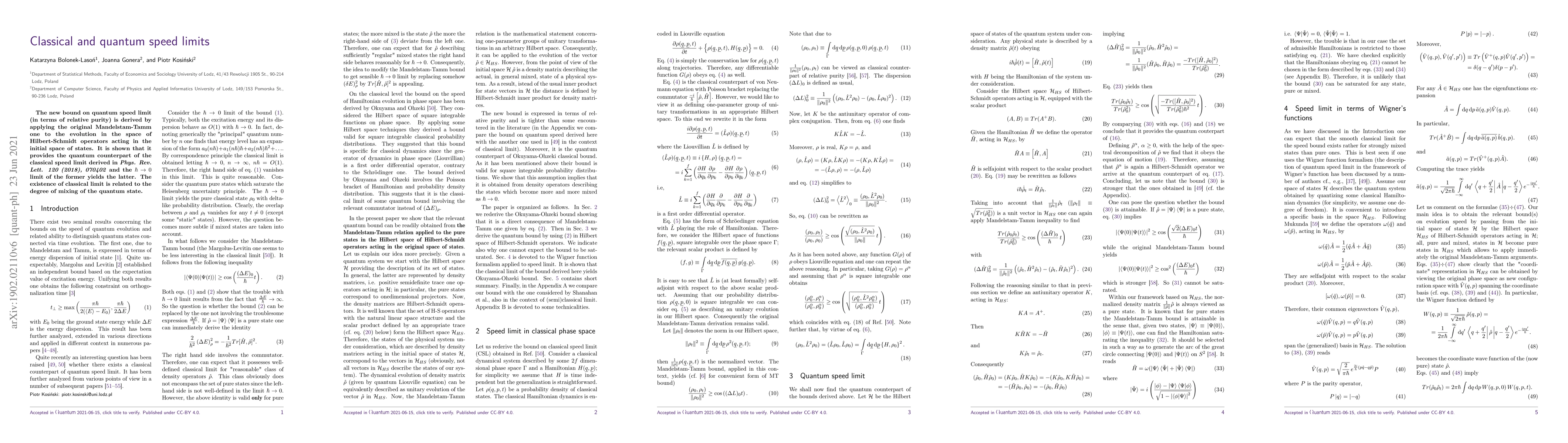 The new bound on quantum speed limit (in terms of relative purity) is derived by applying the original Mandelstam-Tamm one to the evolution in the space of Hilbert-Schmidt operators acting in the initial space of states. It is shown that it provides the quantum counterpart of the classical speed limit derived in Phys. Rev. Lett. 120 (2018), 070402 and the $\hbar\rightarrow 0$ limit of the former yields the latter. The existence of classical limit is related to the degree of mixing of the quantum state.