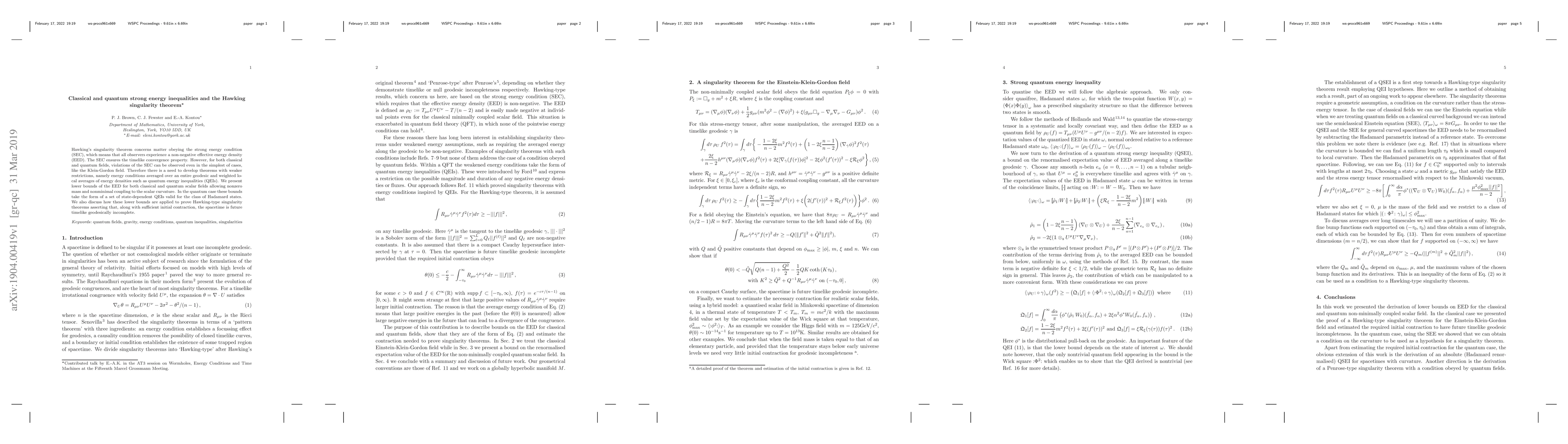 This paper explores classical and quantum strong energy inequalities, presenting lower bounds for effective energy density under averaged and weighted local conditions. It extends Hawking's singularity theorem to scenarios where traditional strong energy conditions are violated, proving future timelike geodesic incompleteness under these conditions.