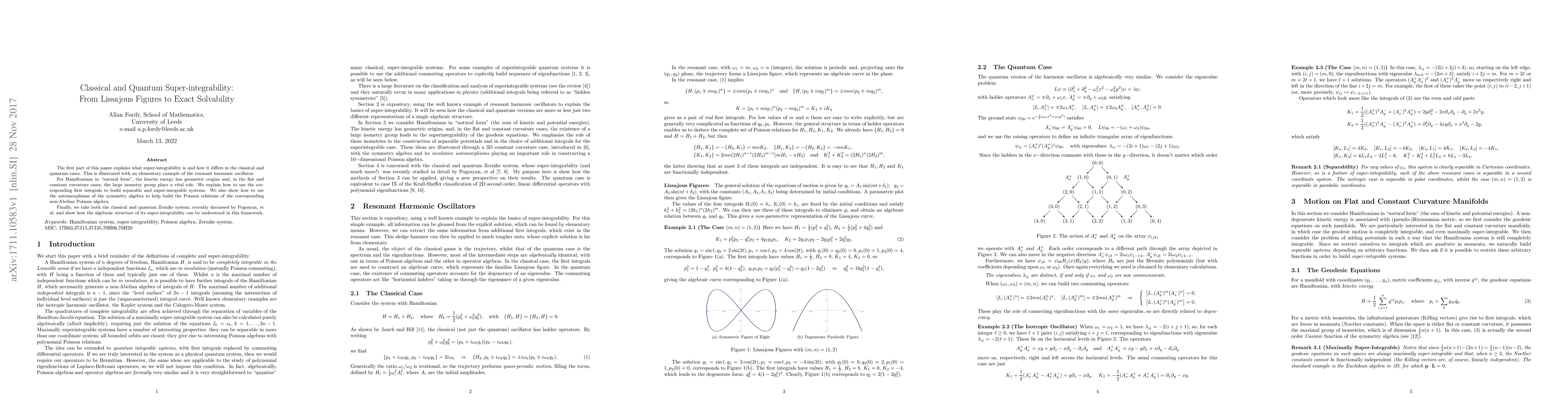 This paper explores classical and quantum super-integrability, distinguishing between the two and illustrating with the resonant harmonic oscillator. It delves into Hamiltonians in "natural form," emphasizing the role of large isometry groups and the construction of separable and super-integrable systems using first integrals and symmetry algebra automorphisms.