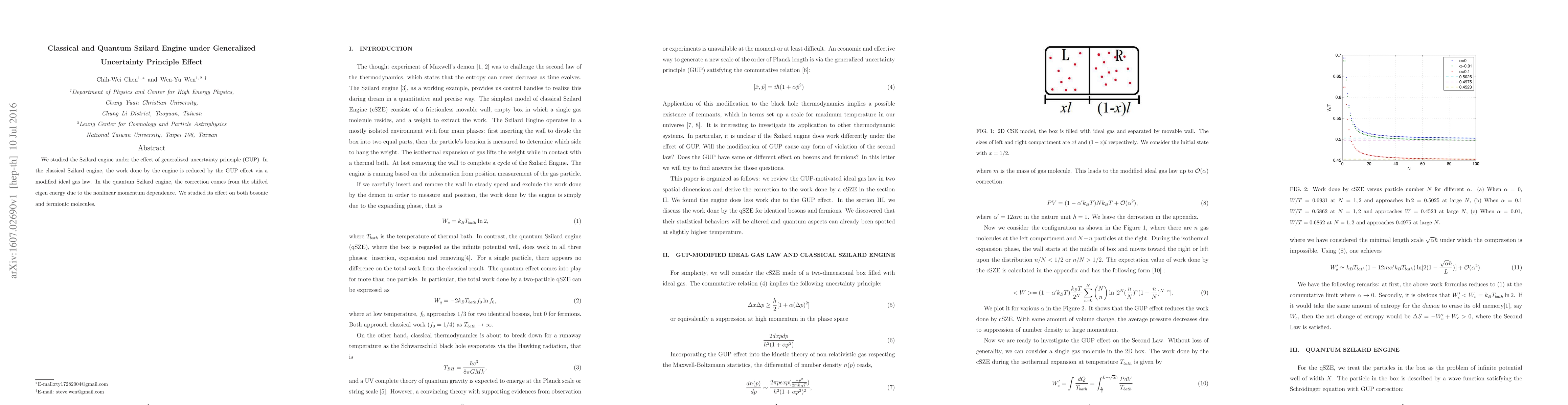 This paper investigates the impact of the generalized uncertainty principle on the Szilard engine, showing that classical work output is reduced via a modified ideal gas law, while quantum corrections arise from shifted eigen energies due to nonlinear momentum dependence, affecting both bosonic and fermionic molecules.