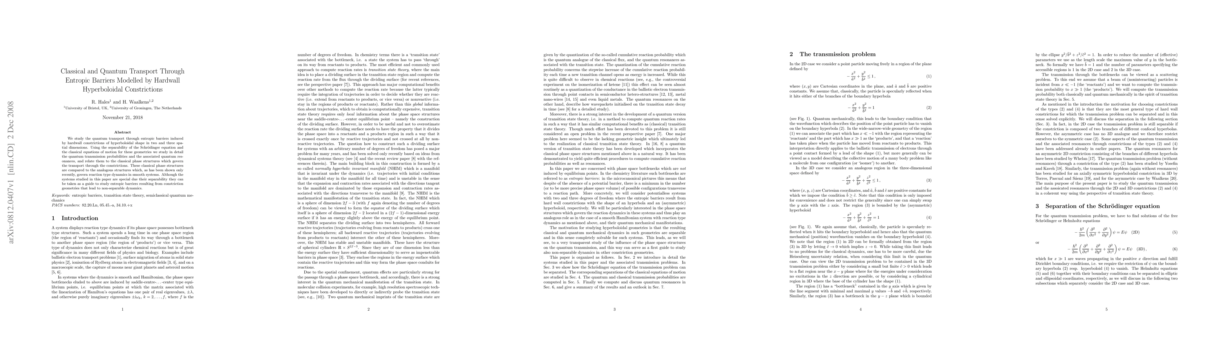 We study the quantum transport through entropic barriers induced by hardwall constrictions of hyperboloidal shape in two and three spatial dimensions. Using the separability of the Schrodinger equation and the classical equations of motion for these geometries we study in detail the quantum transmission probabilities and the associated quantum resonances, and relate them to the classical phase structures which govern the transport through the constrictions. These classical phase structures are compared to the analogous structures which, as has been shown only recently, govern reaction type dynamics in smooth systems. Although the systems studied in this paper are special due their separability they can be taken as a guide to study entropic barriers resulting from constriction geometries that lead to non-separable dynamics.