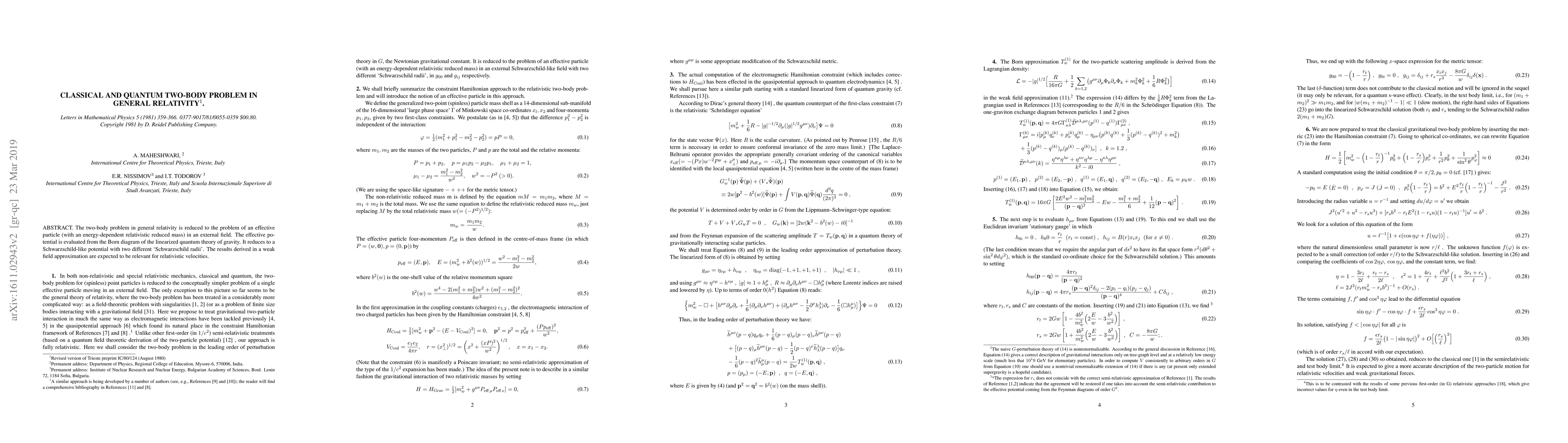 This paper explores the classical and quantum two-body problem in general relativity, reducing it to an effective particle in an external field, and evaluates an effective potential derived from the Born diagram of linearized quantum gravity, revealing a Schwarzschild-like potential with distinct Schwarzschild radii, applicable for relativistic velocities.