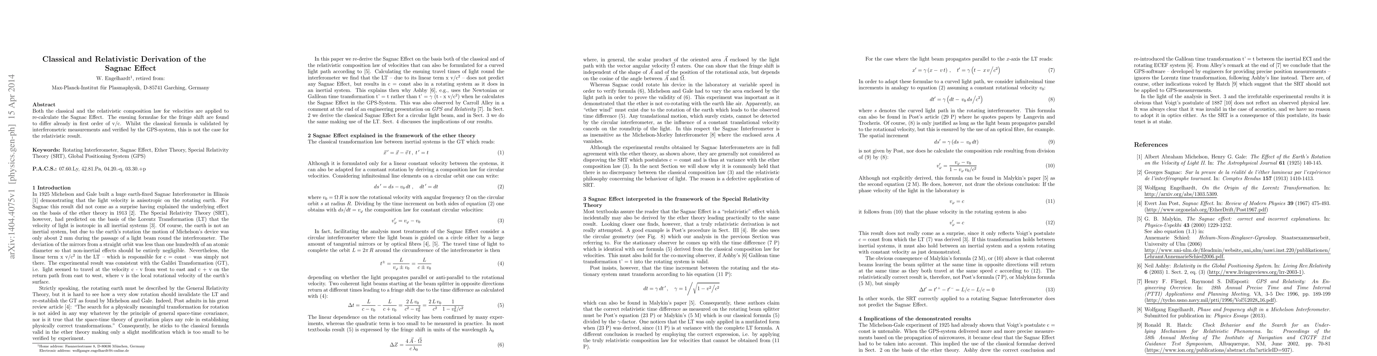 This paper compares classical and relativistic derivations of the Sagnac Effect, finding significant differences in the first-order fringe shift formulas. The classical formula is confirmed by interferometric measurements and GPS systems, but the relativistic result lacks empirical validation.