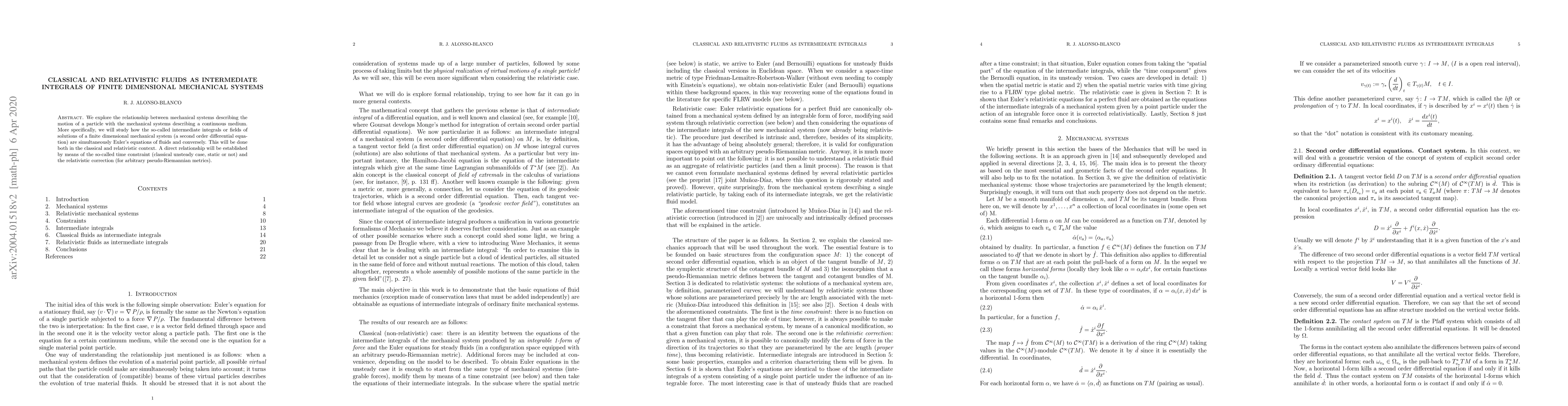 We explore the relationship between mechanical systems describing the motion of a particle with the mechanical systems describing a continuous medium. More specifically, we will study how the so-called intermediate integrals or fields of solutions of a finite dimensional mechanical system (a second order differential equation) are simultaneously Euler's equations of fluids and conversely. This will be done both in the classical and relativistic context. A direct relationship will be established by means of the so-called time constraint (classical unsteady case, static or not) and the relativistic correction (for arbitrary pseudo-Riemannian metrics).