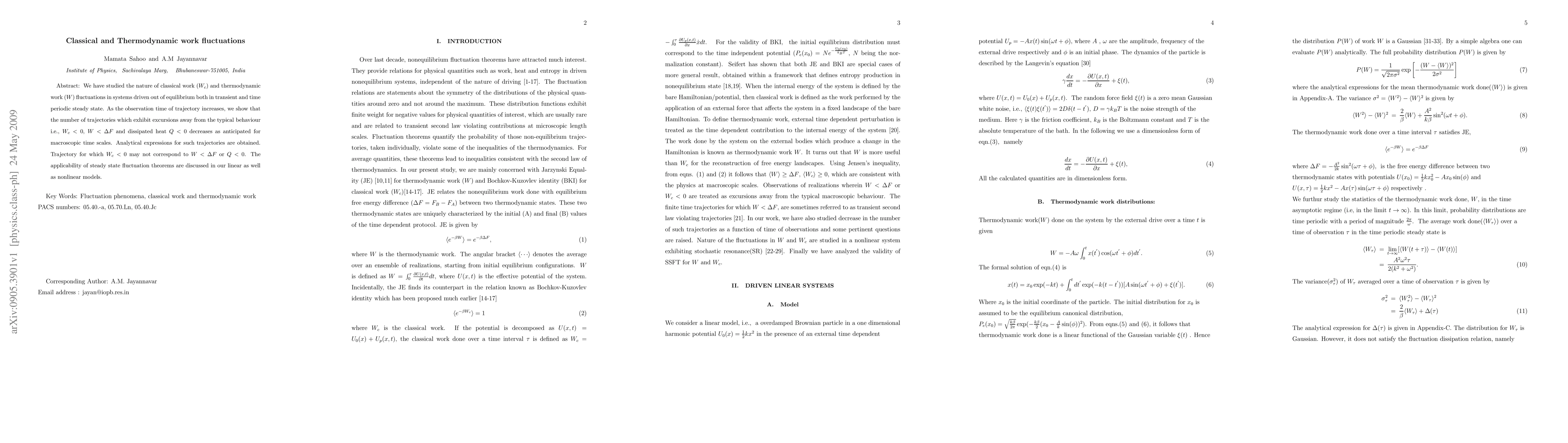 This paper investigates fluctuations in classical work ($W_{c}$) and thermodynamic work ($W$) in non-equilibrium systems, showing that longer observation times reduce deviations from typical behavior. Analytical expressions for these fluctuations are derived, and the applicability of steady-state fluctuation theorems in both linear and nonlinear models is examined.