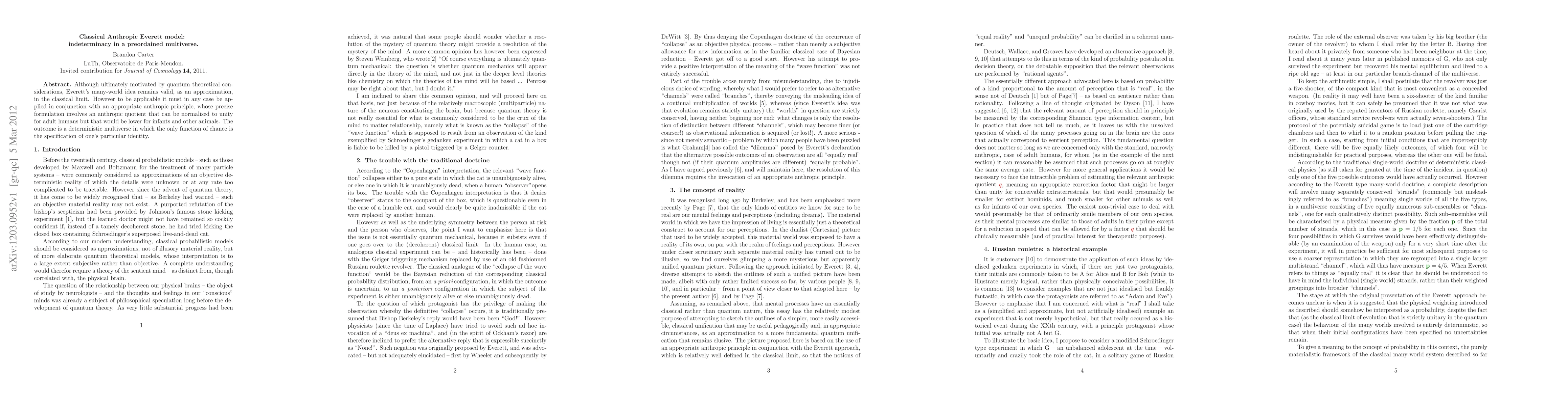 Although ultimately motivated by quantum theoretical considerations, Everett's many-world idea remains valid, as an approximation, in the classical limit. However to be applicable it must in any case be applied in conjunction with an appropriate anthropic principle, whose precise formulation involves an anthropic quotient that can be normalised to unity for adult humans but that would be lower for infants and other animals. The outcome is a deterministic multiverse in which the only function of chance is the specification of one's particular identity.