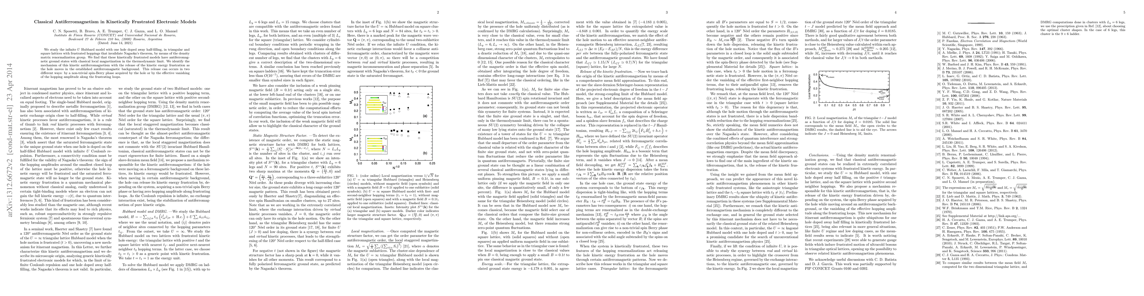 This paper investigates the infinite U Hubbard model on triangular and square lattices, revealing that kinetically frustrated systems exhibit antiferromagnetic ground states with classical local magnetization. The antiferromagnetism arises from the release of kinetic energy frustration, either through a non-trivial spin-Berry phase or by the effective elimination of hopping along frustrating loops.