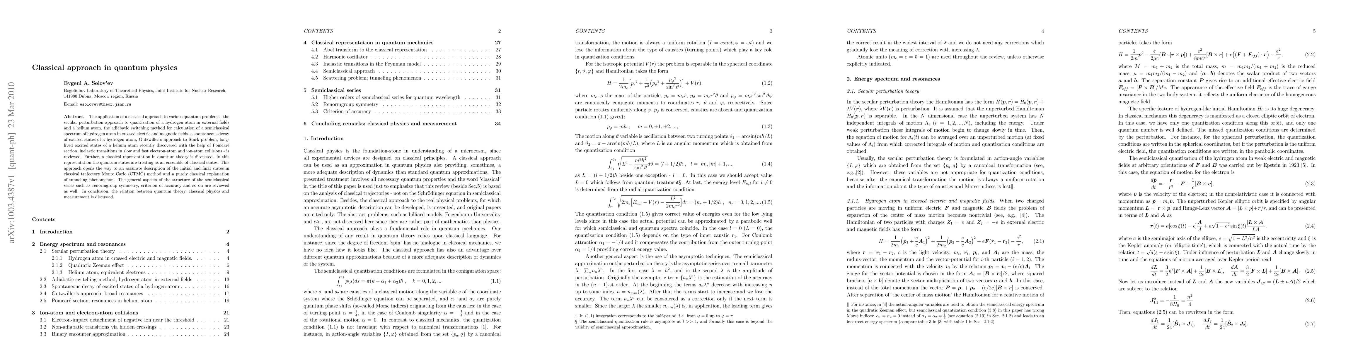 This paper reviews the application of classical methods in quantum physics, including the secular perturbation approach, adiabatic switching, and Gutzwiller's method. It discusses a classical representation of quantum states and its implications for the CTMC method and tunneling explanation. The paper also covers aspects of semiclassical series and the relationship between quantum theory and classical physics.