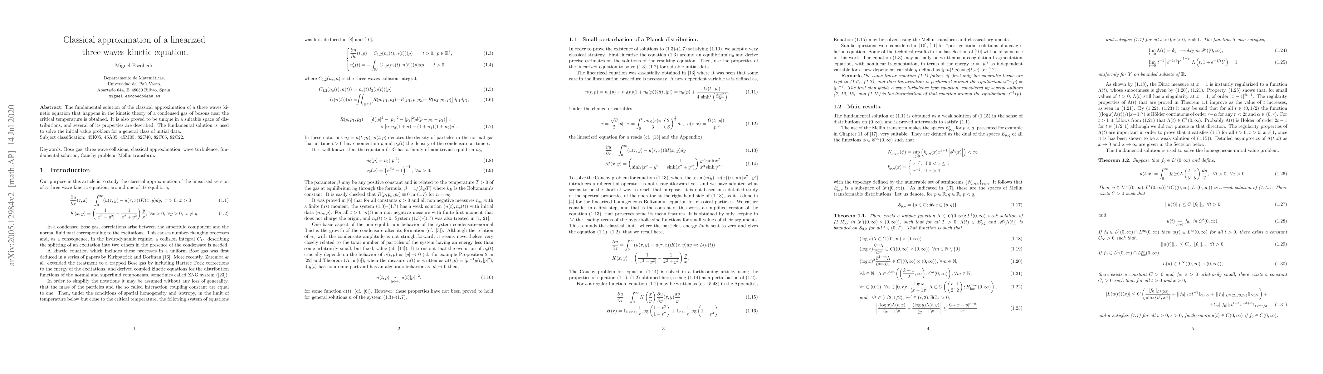 The fundamental solution of the classical approximation of a three waves kinetic equation that happens in the kinetic theory of a condensed gas of bosons near the critical temperature is obtained. It is also proved to be unique in a suitable space of distributions and several of its properties are described. The fundamental solution is used to solve the initial value problem for a general class of initial data.