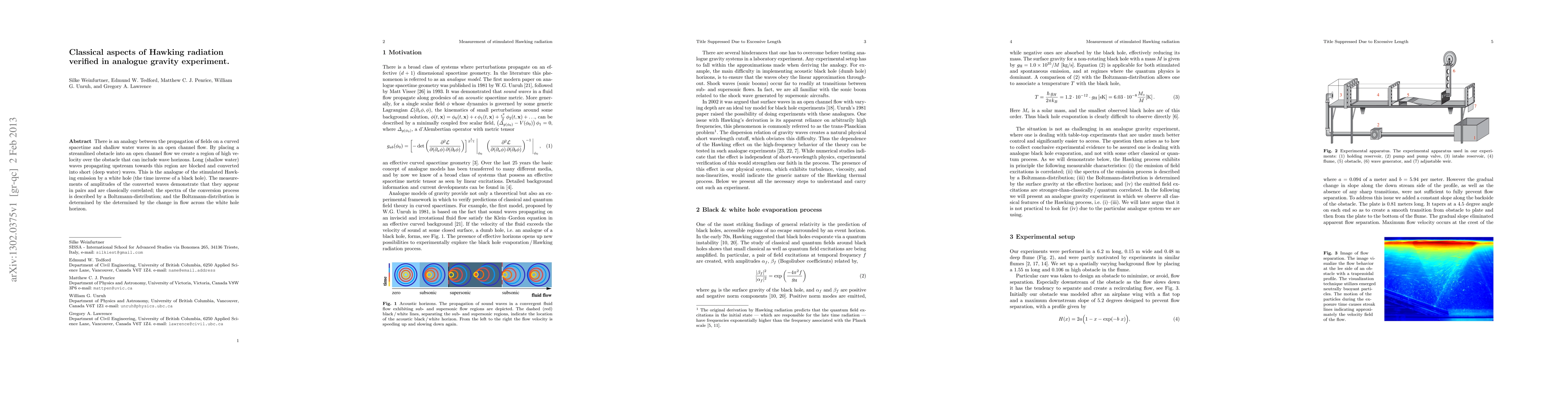There is an analogy between the propagation of fields on a curved spacetime and shallow water waves in an open channel flow. By placing a streamlined obstacle into an open channel flow we create a region of high velocity over the obstacle that can include wave horizons. Long (shallow water) waves propagating upstream towards this region are blocked and converted into short (deep water) waves. This is the analogue of the stimulated Hawking emission by a white hole (the time inverse of a black hole). The measurements of amplitudes of the converted waves demonstrate that they appear in pairs and are classically correlated; the spectra of the conversion process is described by a Boltzmann-distribution; and the Boltzmann-distribution is determined by the determined by the change in flow across the white hole horizon.