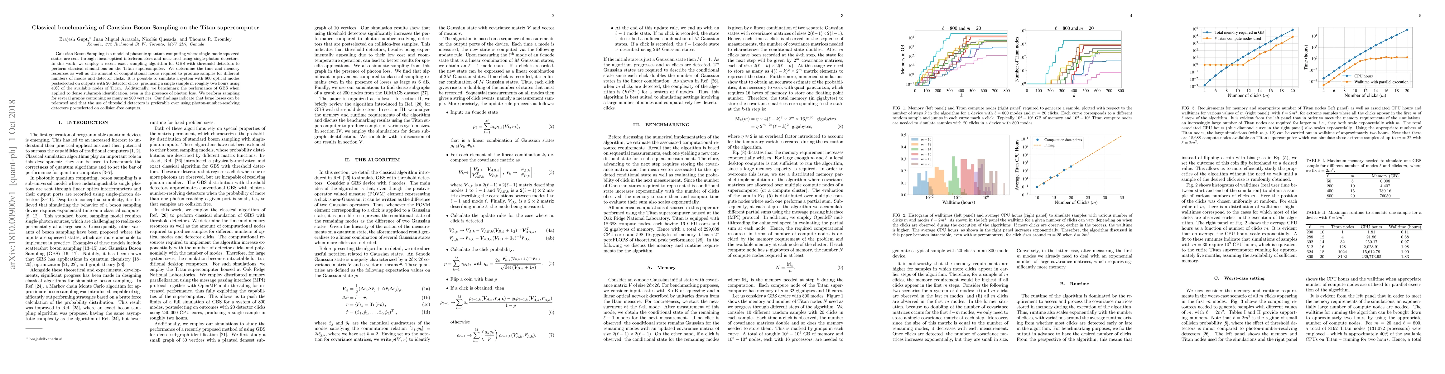 This research benchmarks Gaussian Boson Sampling on the Titan supercomputer, simulating large photonic quantum systems using classical methods. The study finds that it can handle up to 800 modes with 20 clicks in two hours using 40% of Titan's nodes, and demonstrates GBS's effectiveness in dense subgraph identification despite photon loss.