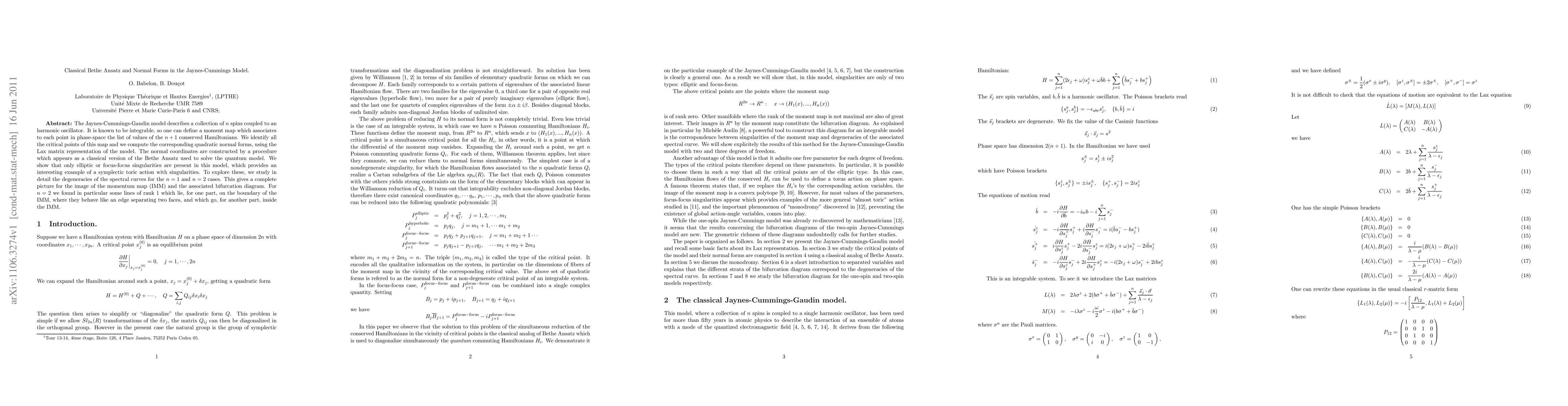 The Jaynes-Cummings-Gaudin model describes a collection of $n$ spins coupled to an harmonic oscillator. It is known to be integrable, so one can define a moment map which associates to each point in phase-space the list of values of the $n+1$ conserved Hamiltonians. We identify all the critical points of this map and we compute the corresponding quadratic normal forms, using the Lax matrix representation of the model. The normal coordinates are constructed by a procedure which appears as a classical version of the Bethe Ansatz used to solve the quantum model. We show that only elliptic or focus-focus singularities are present in this model, which provides an interesting example of a symplectic toric action with singularities. To explore these, we study in detail the degeneracies of the spectral curves for the $n=1$ and $n=2$ cases. This gives a complete picture for the image of the momentum map (IMM) and the associated bifurcation diagram. For $n=2$ we found in particular some lines of rank 1 which lie, for one part, on the boundary of the IMM, where they behave like an edge separating two faces, and which go, for another part, inside the IMM.