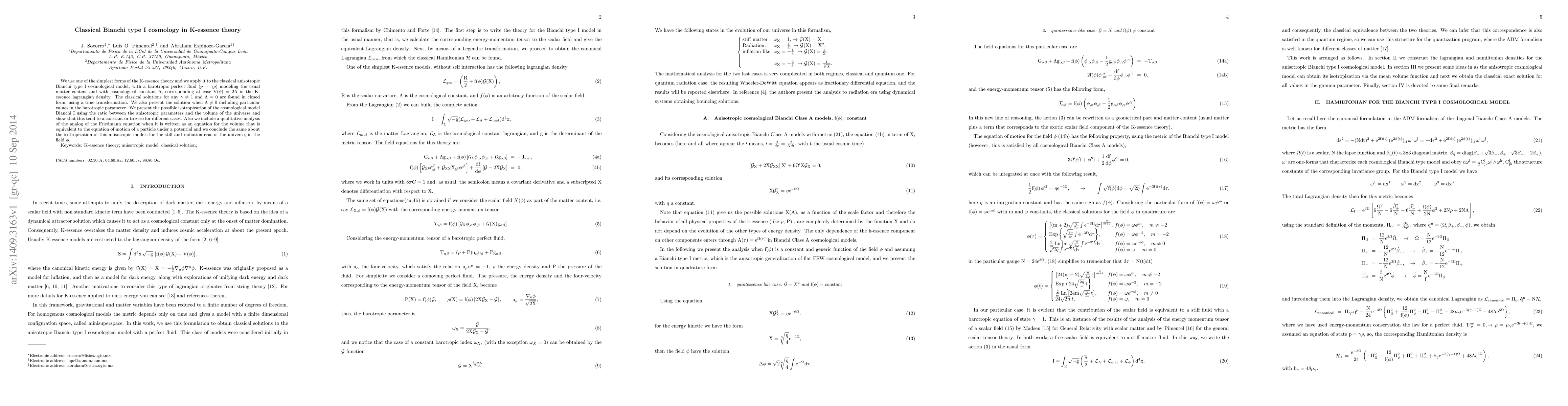 We use one of the simplest forms of the K-essence theory and we apply it to the classical anisotropic Bianchi type I cosmological model, with a barotropic perfect fluid modeling the usual matter content and with cosmological constant. The classical solutions for any but the stiff fluid and without cosmological constant are found in closed form, using a time transformation. We also present the solution whith cosmological constant and some particular values of the barotropic parameter. We present the possible isotropization of the cosmological model, using the ratio between the anisotropic parameters and the volume of the universe and show that this tend to a constant or to zero for different cases. We include also a qualitative analysis of the analog of the Friedmann equation.
