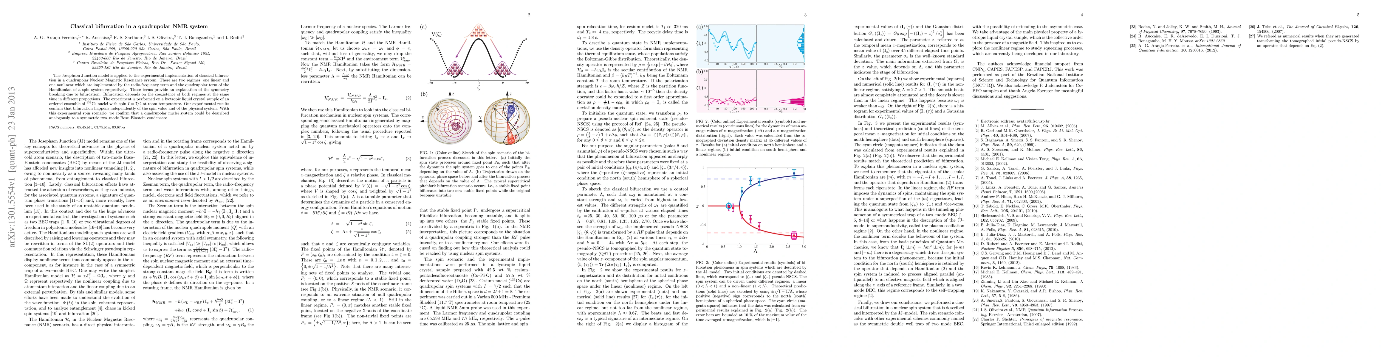 The Josephson Junction model is applied to the experimental implementation of classical bifurcation in a quadrupolar Nuclear Magnetic Resonance system. There are two regimes, one linear and one nonlinear which are implemented by the radio-frequency term and the quadrupolar term of the Hamiltonian of a spin system respectively. Those terms provide an explanation of the symmetry breaking due to bifurcation. Bifurcation depends on the coexistence of both regimes at the same time in different proportions. The experiment is performed on a lyotropic liquid crystal sample of an ordered ensemble of $^{133}$Cs nuclei with spin $I=7/2$ at room temperature. Our experimental results confirm that bifurcation happens independently of the spin value and of the physical system. With this experimental spin scenario, we confirm that a quadrupolar nuclei system could be described analogously to a symmetric two--mode Bose--Einstein condensate.