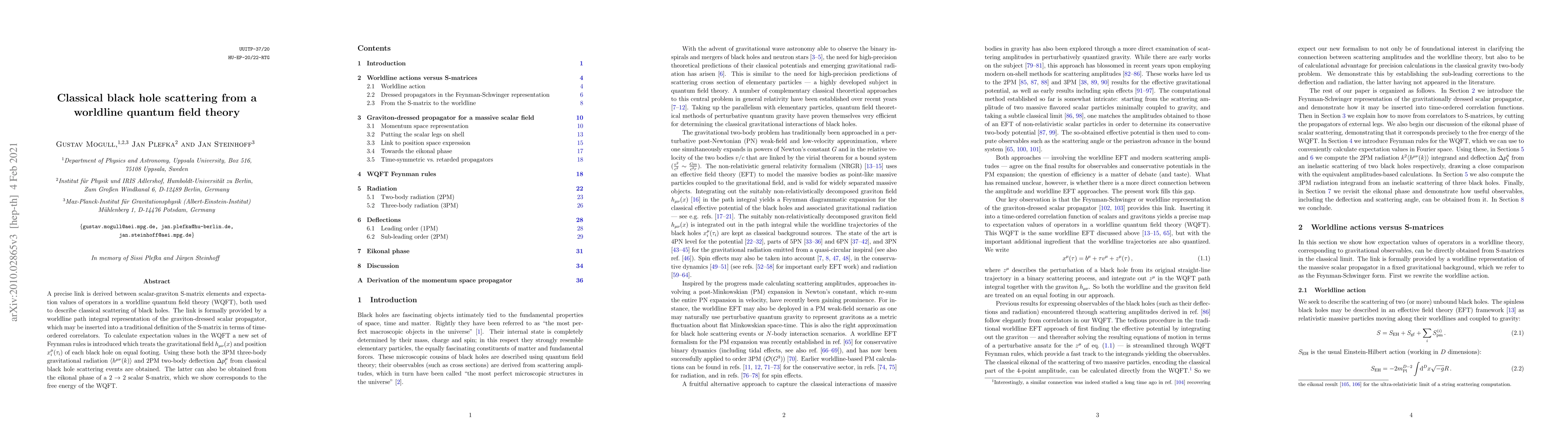 A precise link is derived between scalar-graviton S-matrix elements and expectation values of operators in a worldline quantum field theory (WQFT), both used to describe classical scattering of a pair of black holes. The link is formally provided by a worldline path integral representation of the graviton-dressed scalar propagator, which may be inserted into a traditional definition of the S-matrix in terms of time-ordered correlators. To calculate expectation values in the WQFT a new set of Feynman rules is introduced which treats the gravitational field $h_{\mu\nu}(x)$ and position $x_i^\mu(\tau_i)$ of each black hole on equal footing. Using these both the next-order classical gravitational radiation $\langle h^{\mu\nu}(k)\rangle$ (previously unknown) and deflection $\Delta p_i^\mu$ from a binary black hole scattering event are obtained. The latter can also be obtained from the eikonal phase of a $2\to2$ scalar S-matrix, which we show to correspond to the free energy of the WQFT.