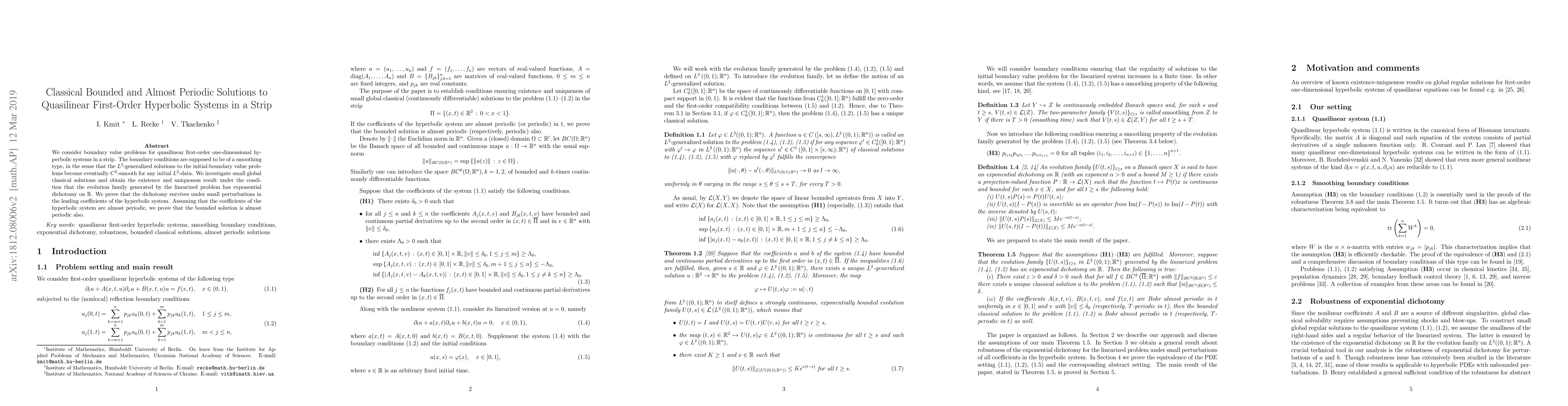 We consider boundary value problems for quasilinear first-order one-dimensional hyperbolic systems in a strip. The boundary conditions are supposed to be of a smoothing type, in the sense that the $L^2$-generalized solutions to the initial-boundary value problems become eventually $C^2$-smooth for any initial $L^2$-data. We investigate small global classical solutions and obtain the existence and uniqueness result under the condition that the evolution family generated by the linearized problem has exponential dichotomy on R. We prove that the dichotomy survives under small perturbations in the leading coefficients of the hyperbolic system. Assuming that the coefficients of the hyperbolic system are almost periodic, we prove that the bounded solution is almost periodic also.