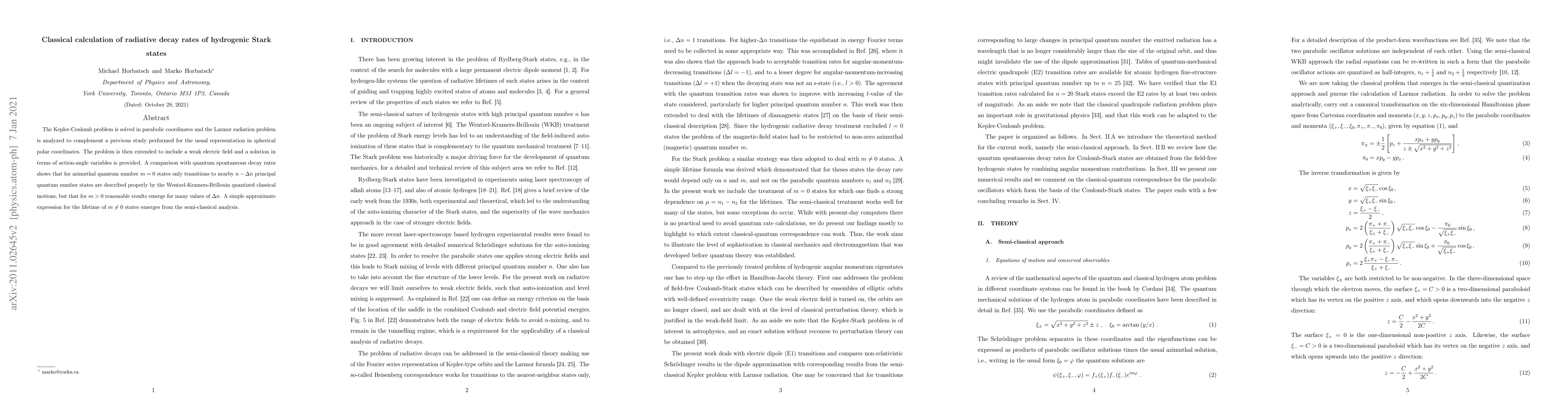 The Kepler-Coulomb problem is solved in parabolic coordinates and the Larmor radiation problem is analyzed to complement a previous study performed for the usual representation in spherical polar coordinates. A comparison with quantum spontaneous decay rates shows that for azimuthal quantum number $m = 0$ states only transitions to nearby $n-\Delta n$ principal quantum number states are described properly by the Wentzel-Kramers-Brillouin quantized classical motions, but that for $m > 0$ reasonable results emerge for many values of $\Delta n$. A simple approximate expression for the lifetime of $m \ne 0$ states emerges from the semi-classical analysis.