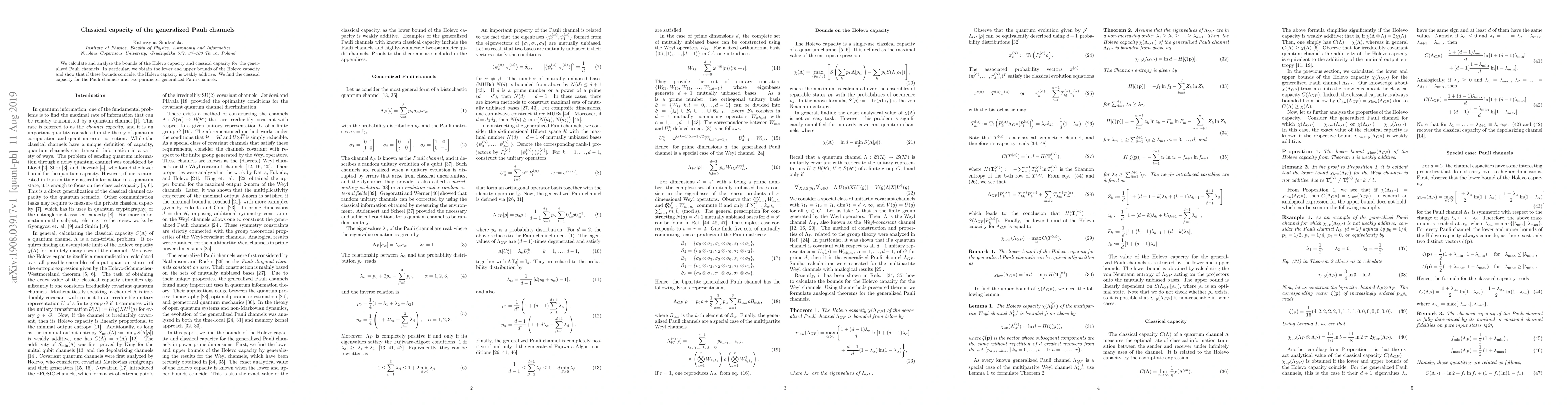 This paper calculates and analyzes the Holevo capacity and classical capacity bounds for generalized Pauli channels, demonstrating that when the bounds coincide, the Holevo capacity is weakly additive, and it determines the classical capacity for both Pauli and generalized Pauli channels.