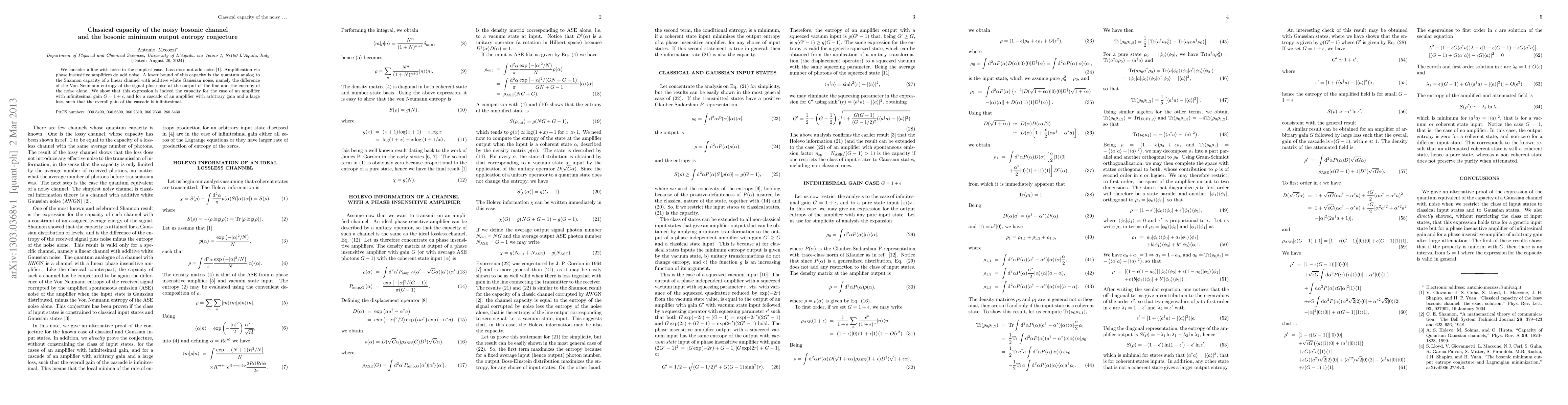 We consider a line with noise in the simplest case. Loss does not add noise. Amplification via phase insensitive amplifiers do add noise. A lower bound of this capacity is the quantum analog to the Shannon capacity of a linear channel with additive white Gaussian noise, namely the difference of the Von Neumann entropy of the signal plus noise at the output of the line and the entropy of the noise alone. We show that this expression is indeed the capacity for the case of an amplifier with infinitesimal gain $G = 1+\epsilon$, and for a cascade of an amplifier with arbitrary gain and a large loss, such that the overall gain of the cascade is infinitesimal.
