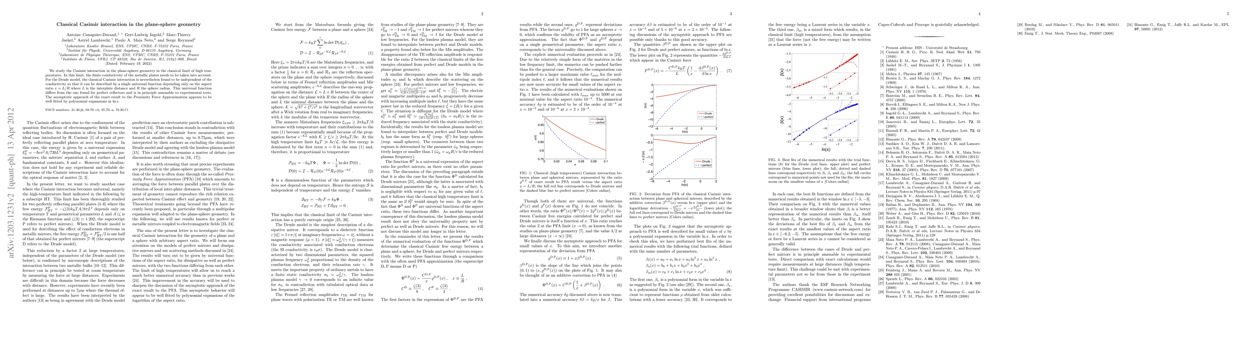 We study the Casimir interaction in the plane-sphere geometry in the classical limit of high temperatures. In this limit, the finite conductivity of the metallic plates needs to be taken into account. For the Drude model, the classical Casimir interaction is nevertheless found to be independent of the conductivity so that it can be described by a single universal function depending only on the aspect ratio $x=L/R$ where $L$ is the interplate distance and $R$ the sphere radius. This universal function differs from the one found for perfect reflectors and is in principle amenable to experimental tests. The asymptotic approach of the exact result to the Proximity Force Approximation appears to be well fitted by polynomial expansions in $\ln x$.