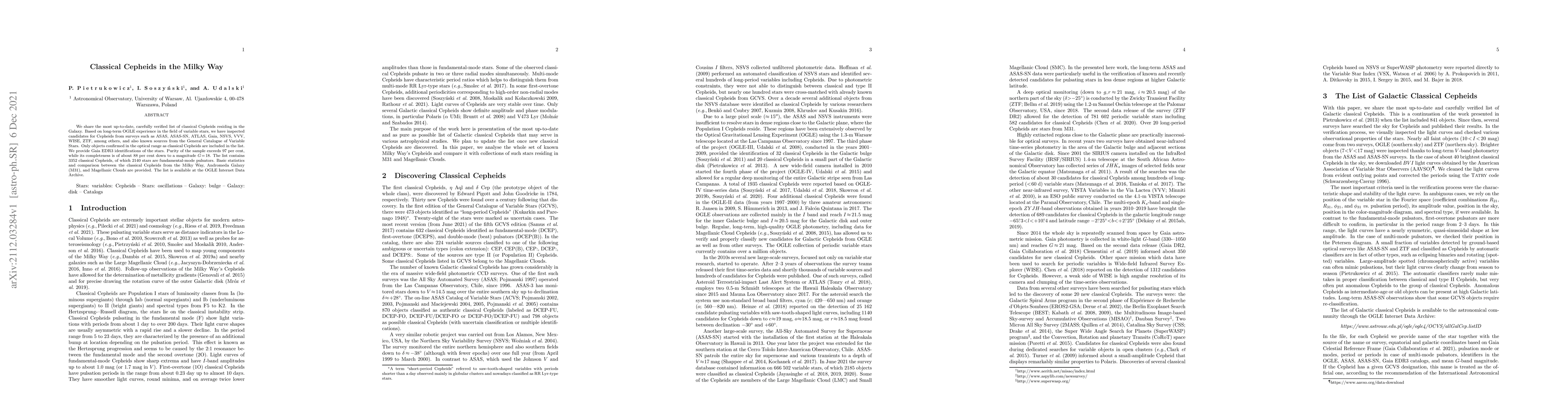 This paper presents a meticulously verified catalog of 3352 classical Cepheids in the Milky Way, with 97% purity and 88% completeness down to G=18. The list includes Gaia EDR3 identifications and compares Milky Way Cepheids with those in Andromeda Galaxy and Magellanic Clouds.