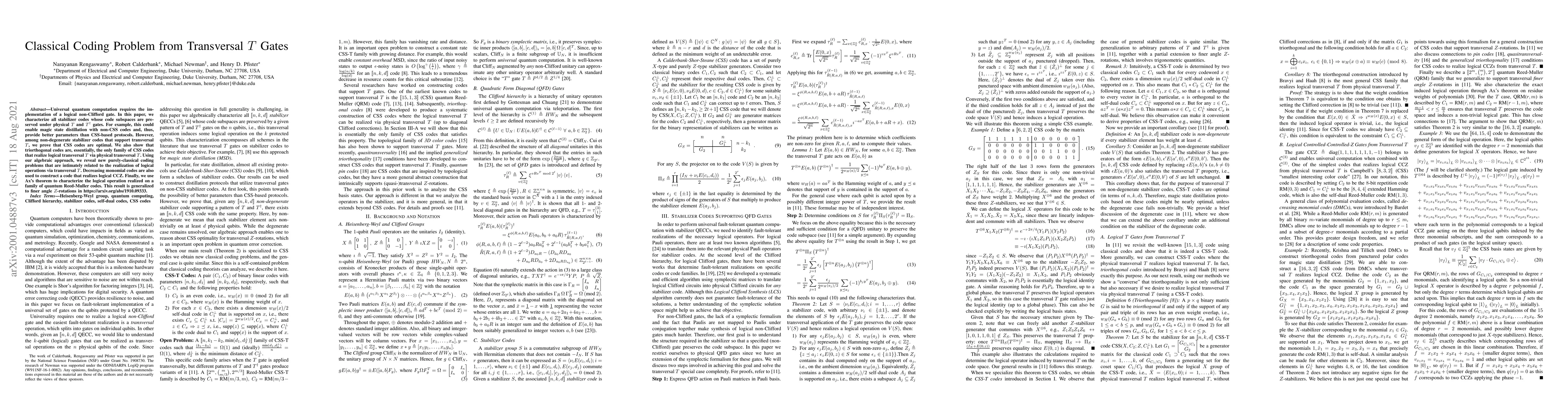This paper characterizes stabilizer codes preserving subspaces under transversal $T$ gates, proving that CSS codes are optimal for such operations. It identifies triorthogonal codes as the primary family enabling logical transversal $T$ through physical transversal $T$, and uses algebraic methods to explore related classical coding problems and logical CCZ operations.