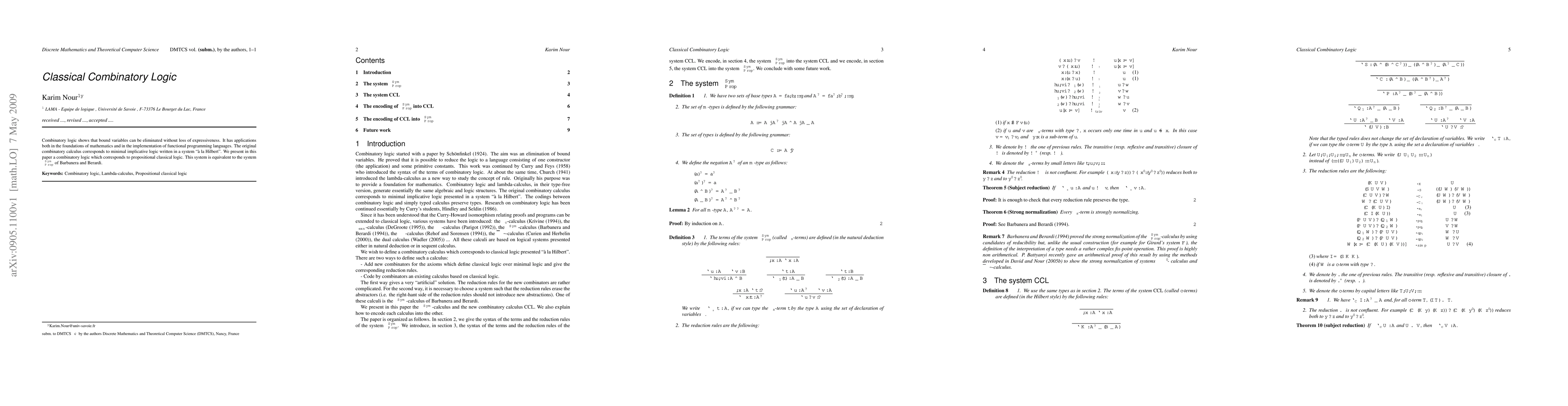 This paper presents a combinatory logic system that corresponds to propositional classical logic, demonstrating its equivalence to the $\lambda^{Sym}_{Prop}$ system, and highlights its implications for both mathematical foundations and functional programming languages.