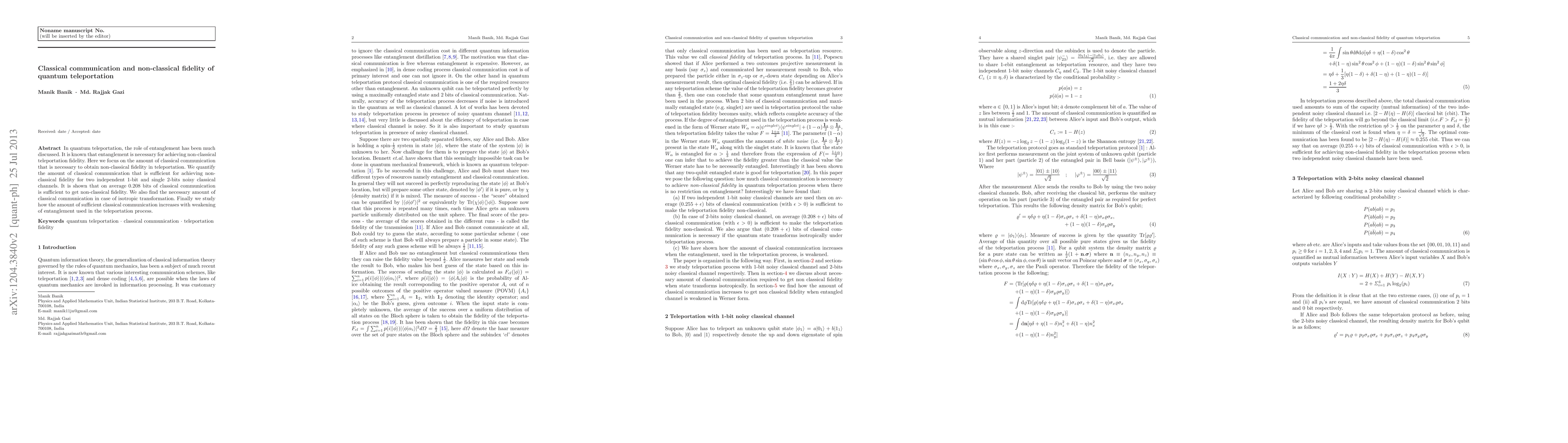 In quantum teleportation, the role of entanglement has been much discussed. It is known that entanglement is necessary for achieving non-classical teleportation fidelity. Here we focus on the amount of classical communication that is necessary to obtain non-classical fidelity in teleportation. We quantify the amount of classical communication that is sufficient for achieving non-classical fidelity for two independent 1-bit and single 2-bits noisy classical channels. It is shown that on average 0.208 bits of classical communication is sufficient to get non-classical fidelity. We also find the necessary amount of classical communication in case of isotropic transformation. Finally we study how the amount of sufficient classical communication increases with weakening of entanglement used in the teleportation process.