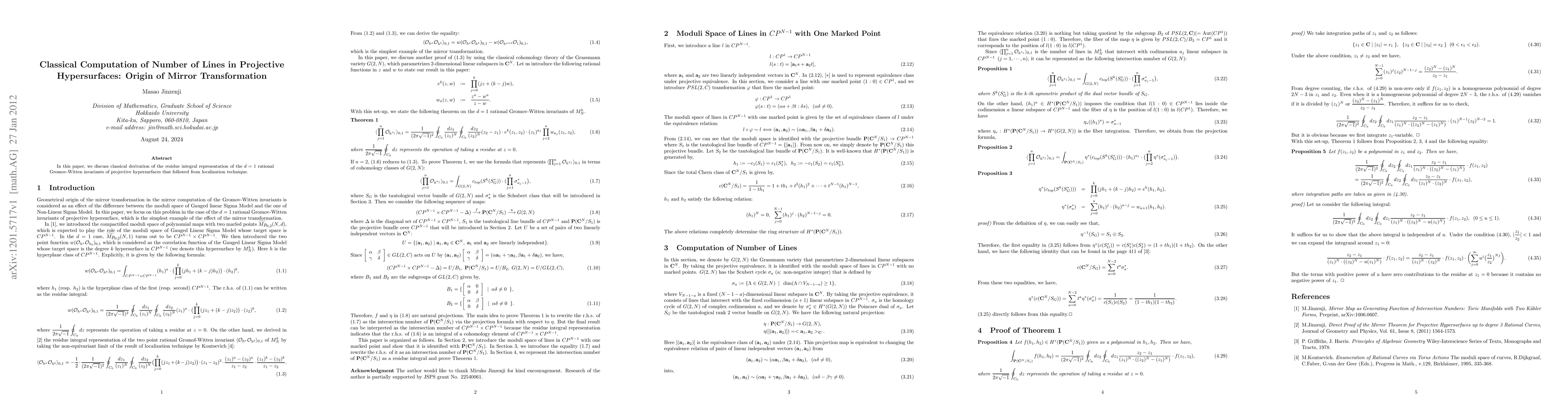In this paper, we discuss classical derivation of the residue integral representation of the d=1 rational Gromov-Witten invariants of projective hypersurfaces that followed from localization technique.