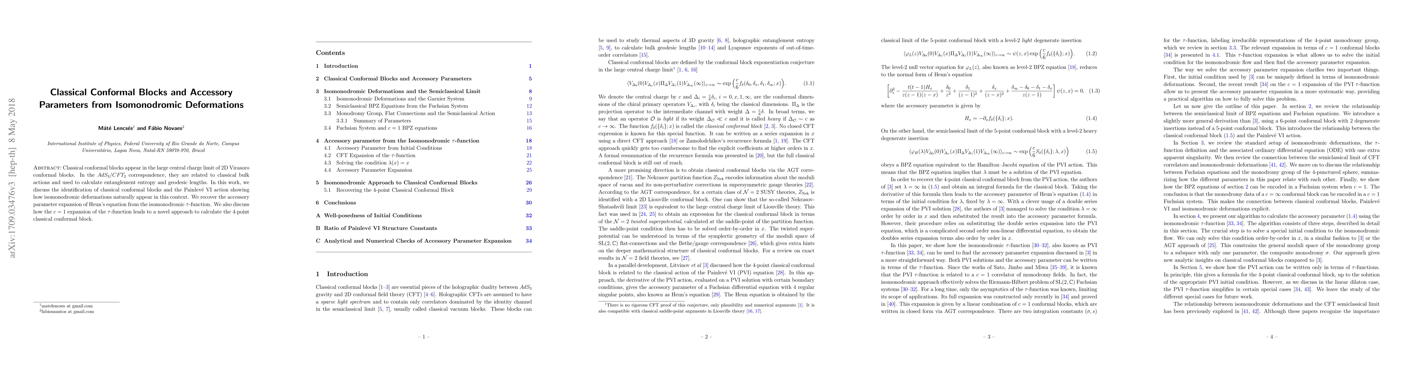 This paper identifies classical conformal blocks within the large central charge limit of 2D Virasoro blocks and links them to classical bulk actions in the $AdS_{3}/CFT_{2}$ correspondence. It reveals the connection between these blocks and the Painlevé VI action, showcasing the emergence of isomonodromic deformations and deriving the accessory parameter expansion from Heun's equation via the isomonodromic $\tau$-function.