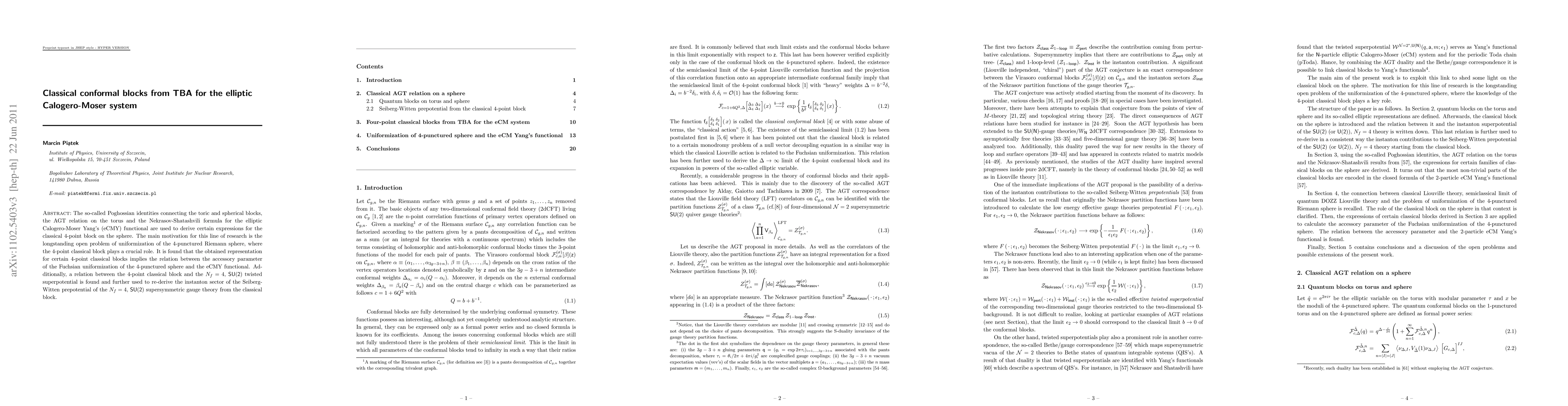 The so-called Poghossian identities connecting the toric and spherical blocks, the AGT relation on the torus and the Nekrasov-Shatashvili formula for the elliptic Calogero-Moser Yang's (eCMY) functional are used to derive certain expressions for the classical 4-point block on the sphere. The main motivation for this line of research is the longstanding open problem of uniformization of the 4-punctured Riemann sphere, where the 4-point classical block plays a crucial role. It is found that the obtained representation for certain 4-point classical blocks implies the relation between the accessory parameter of the Fuchsian uniformization of the 4-punctured sphere and the eCMY functional. Additionally, a relation between the 4-point classical block and the $N_f=4$, ${\sf SU(2)}$ twisted superpotential is found and further used to re-derive the instanton sector of the Seiberg-Witten prepotential of the $N_f=4$, ${\sf SU(2)}$ supersymmetric gauge theory from the classical block.