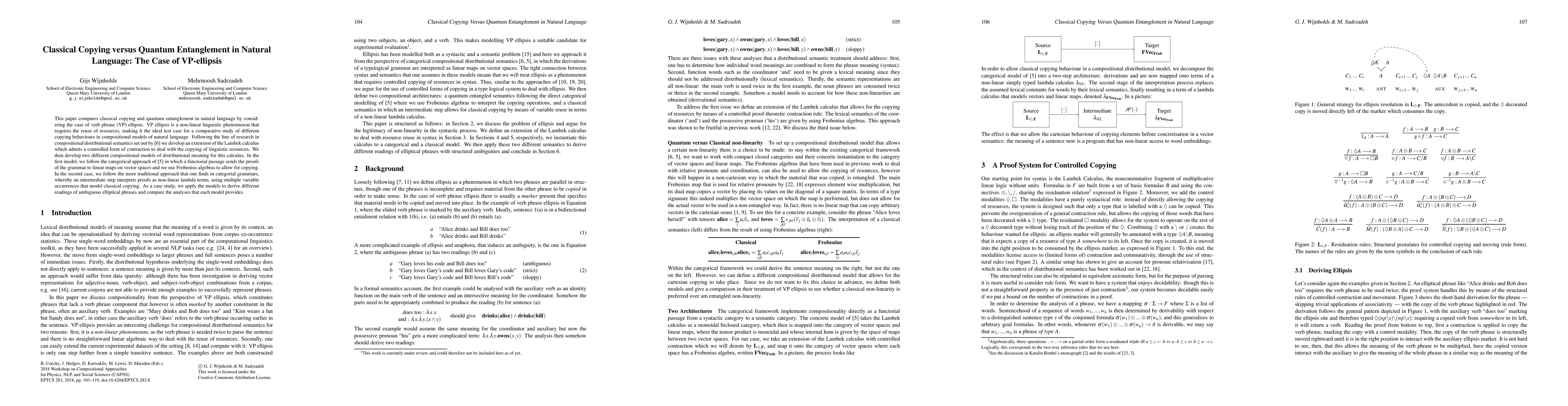 This paper compares classical copying and quantum entanglement in natural language by considering the case of verb phrase (VP) ellipsis. VP ellipsis is a non-linear linguistic phenomenon that requires the reuse of resources, making it the ideal test case for a comparative study of different copying behaviours in compositional models of natural language. Following the line of research in compositional distributional semantics set out by (Coecke et al., 2010) we develop an extension of the Lambek calculus which admits a controlled form of contraction to deal with the copying of linguistic resources. We then develop two different compositional models of distributional meaning for this calculus. In the first model, we follow the categorical approach of (Coecke et al., 2013) in which a functorial passage sends the proofs of the grammar to linear maps on vector spaces and we use Frobenius algebras to allow for copying. In the second case, we follow the more traditional approach that one finds in categorial grammars, whereby an intermediate step interprets proofs as non-linear lambda terms, using multiple variable occurrences that model classical copying. As a case study, we apply the models to derive different readings of ambiguous elliptical phrases and compare the analyses that each model provides.