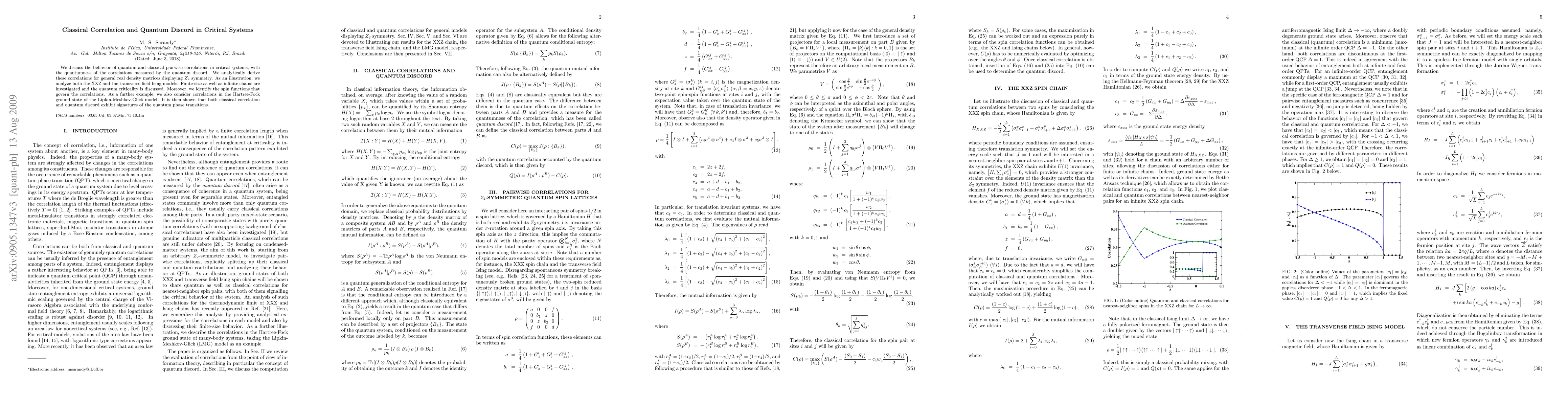 This paper investigates quantum and classical correlations in critical systems, measuring quantumness via quantum discord. It analyzes the XXZ and Ising models, identifying spin functions that govern correlations, and demonstrates signatures of quantum phase transitions in both classical correlation and quantum discord in finite and infinite chains.