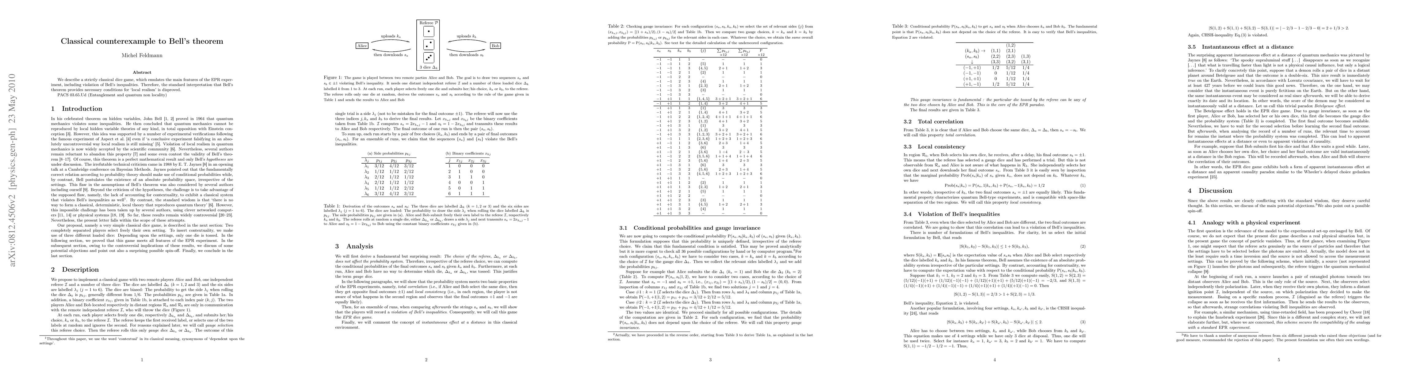 Summary: This paper presents a classical dice game that violates Bell's inequalities, challenging the standard interpretation that Bell's theorem necessitates local realism, thereby offering a counterexample to the theorem's implications.